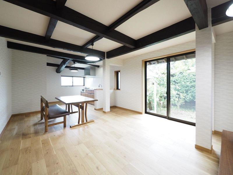梁の魅力を最大に活かしたデザインでモダンな仕上がりになりました。ホール~リビングダイニング~キッチンの壁を無くし、間取りを変更。約20帖のLDKへと生まれ変わりました。リビングにはTVを壁掛けに出来るよう間仕切り壁を作り、広々空間を有効に使えます。水回りも一新し、トイレ・洗面室を移設することによりゆとりのある空間を確保。大好きなウィリアム・モリスのクロスを選定し、優しく落ち着いた空間に変わりました。