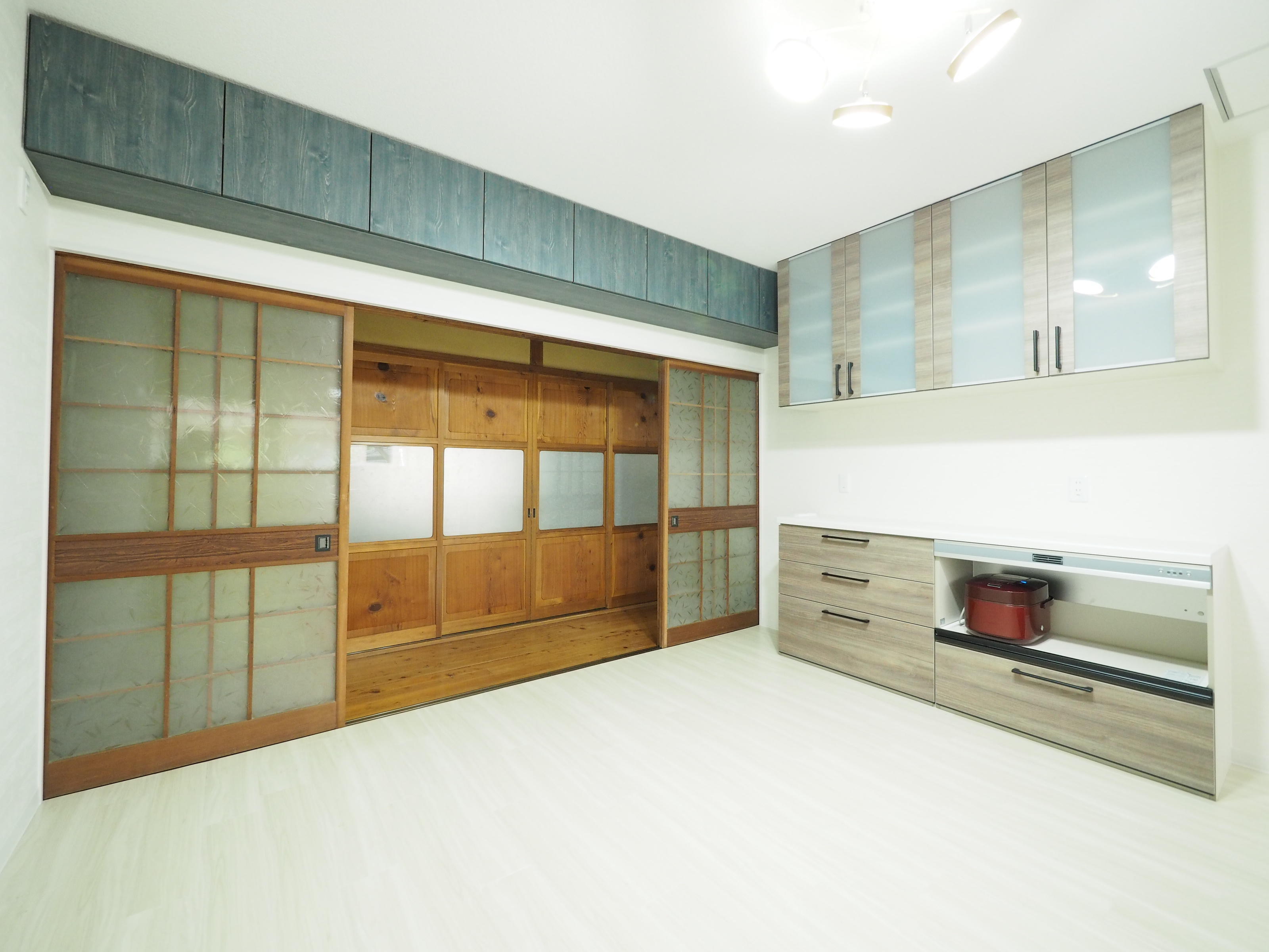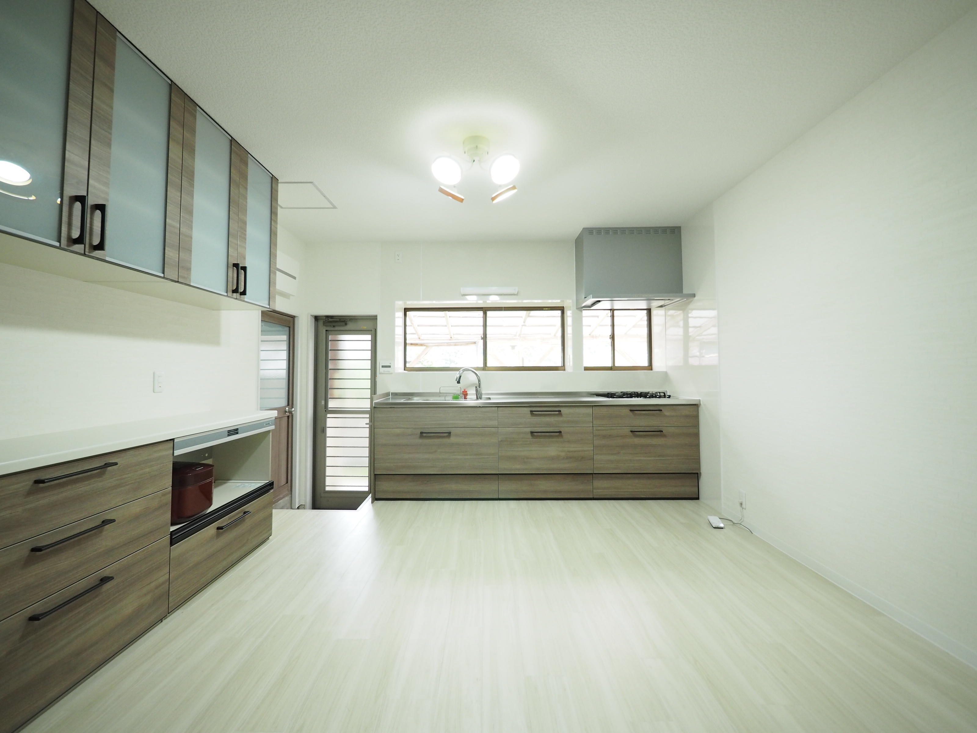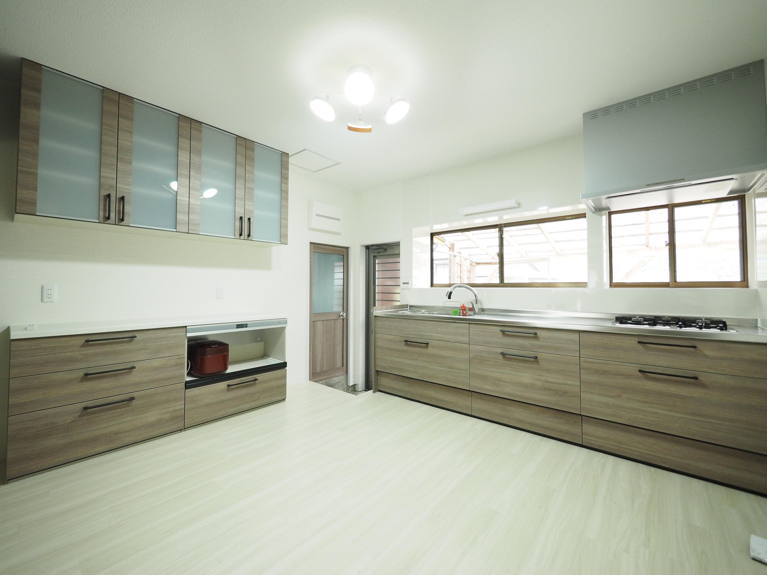 リアルな木質感のウォルナット柄のキッチン扉と、「ウォルナット柄が映えるように」と、お施主様が選ばれたホワイト系のクッションフロアで、白と木目のコントラストが美しい、モダンでナチュラルなキッチンとなりました。