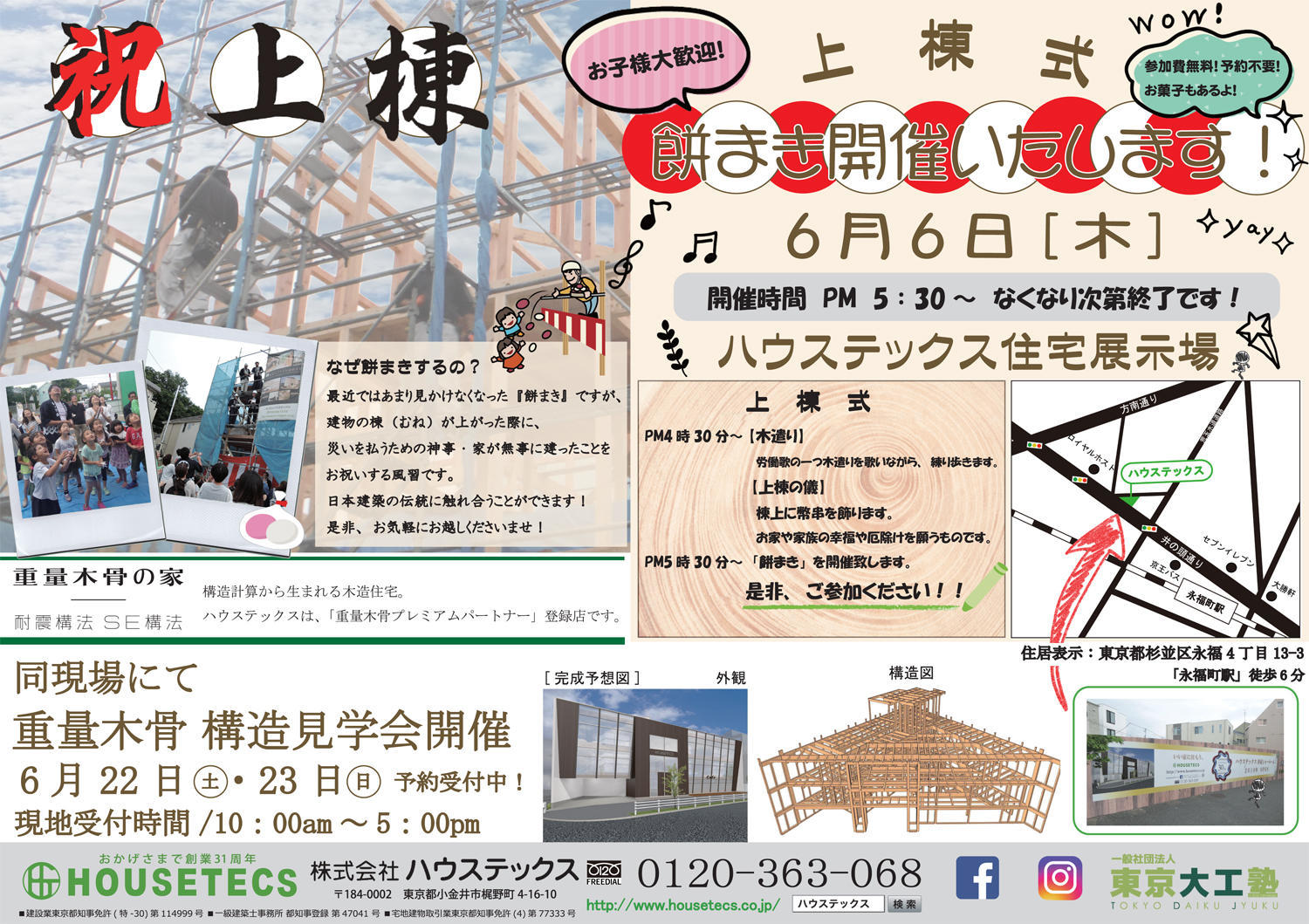 いよいよ本日6月6日(木)杉並ショールームにて上棟式・餅まきが行われます!