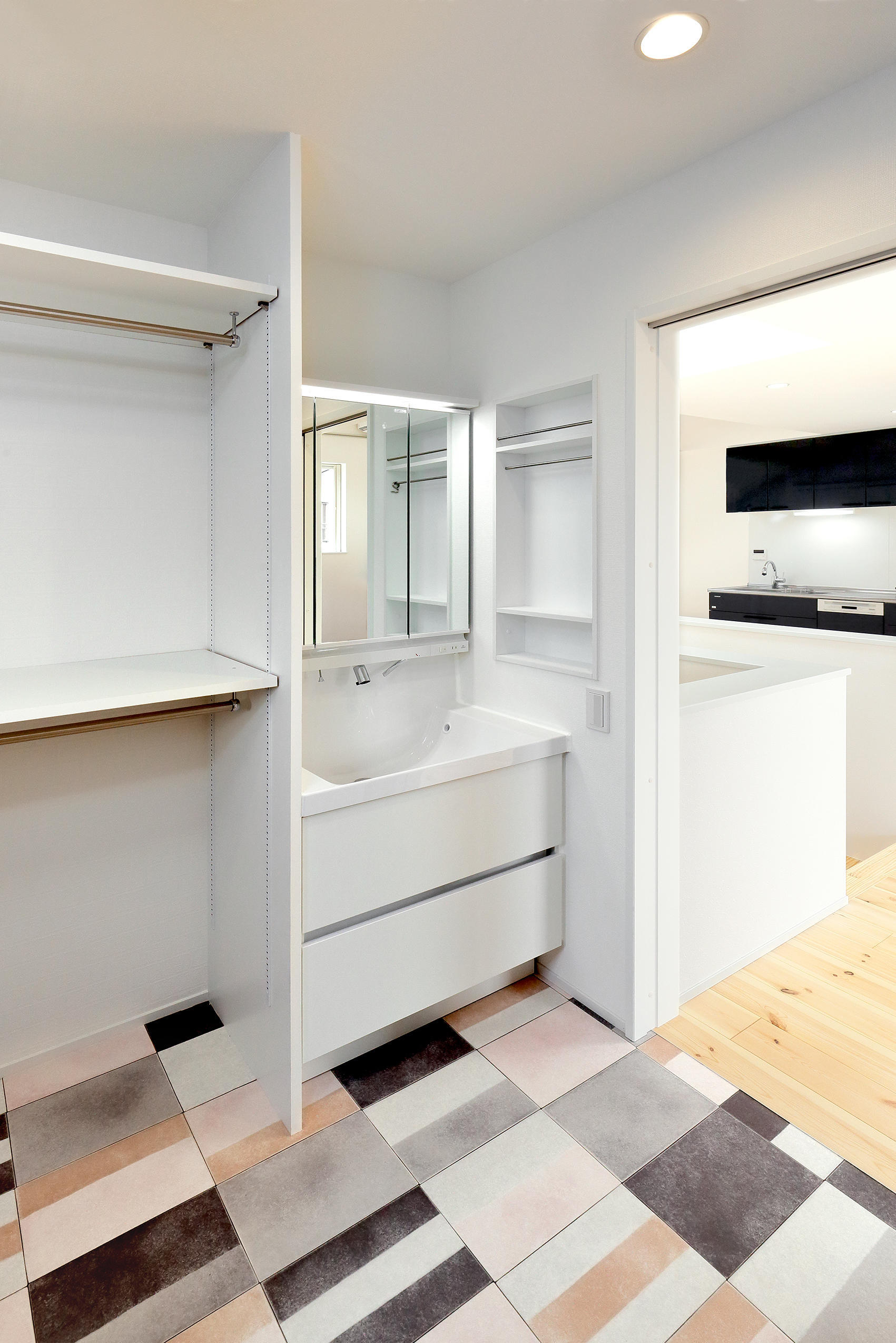 玄関を入ってすぐ目に飛び込んでくるのは白の壁にくっきりと映える黒の手洗いスペース。