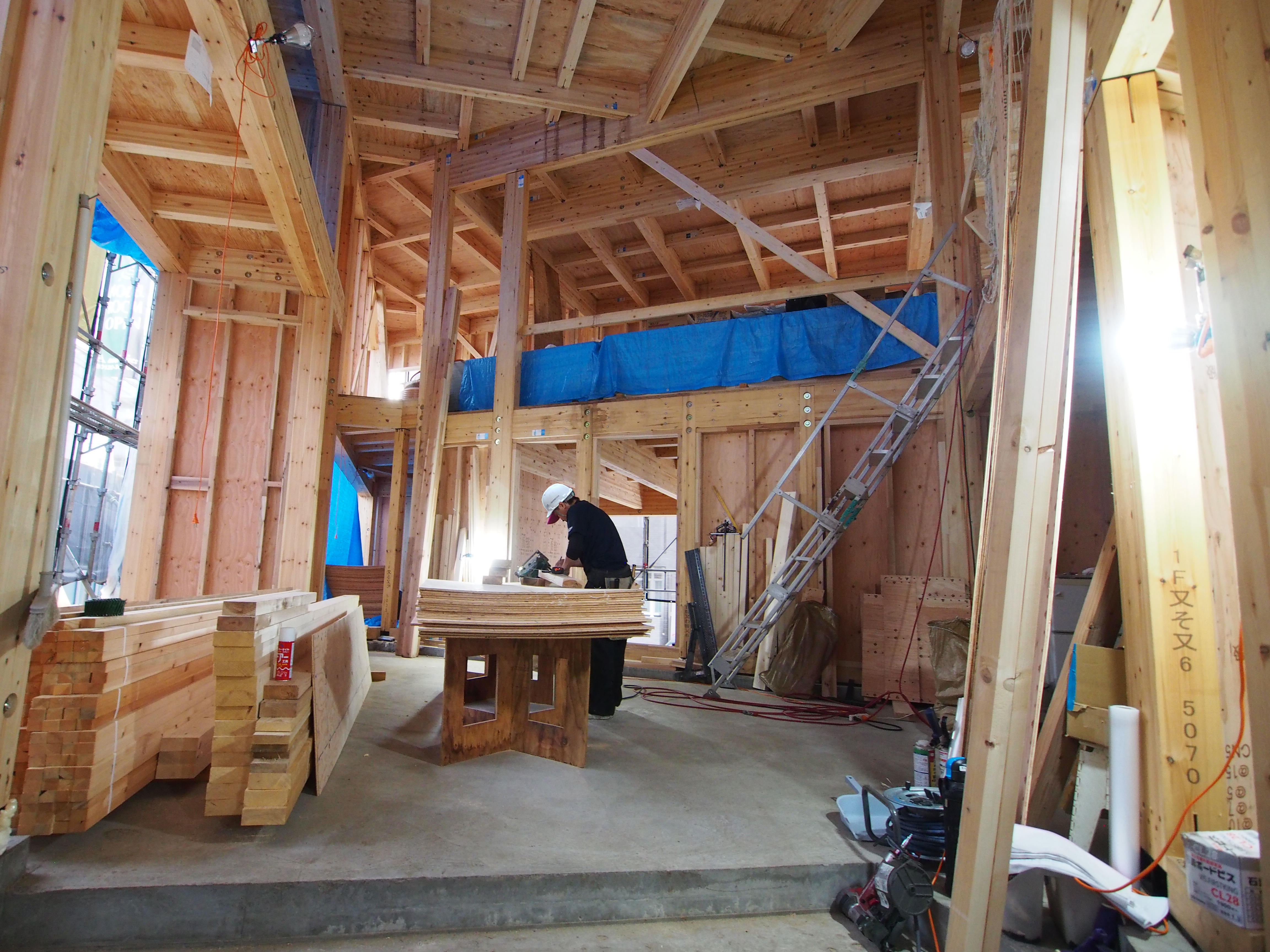 木造でありながら鉄骨造のように柱・梁で支えるため、強度が強い。)