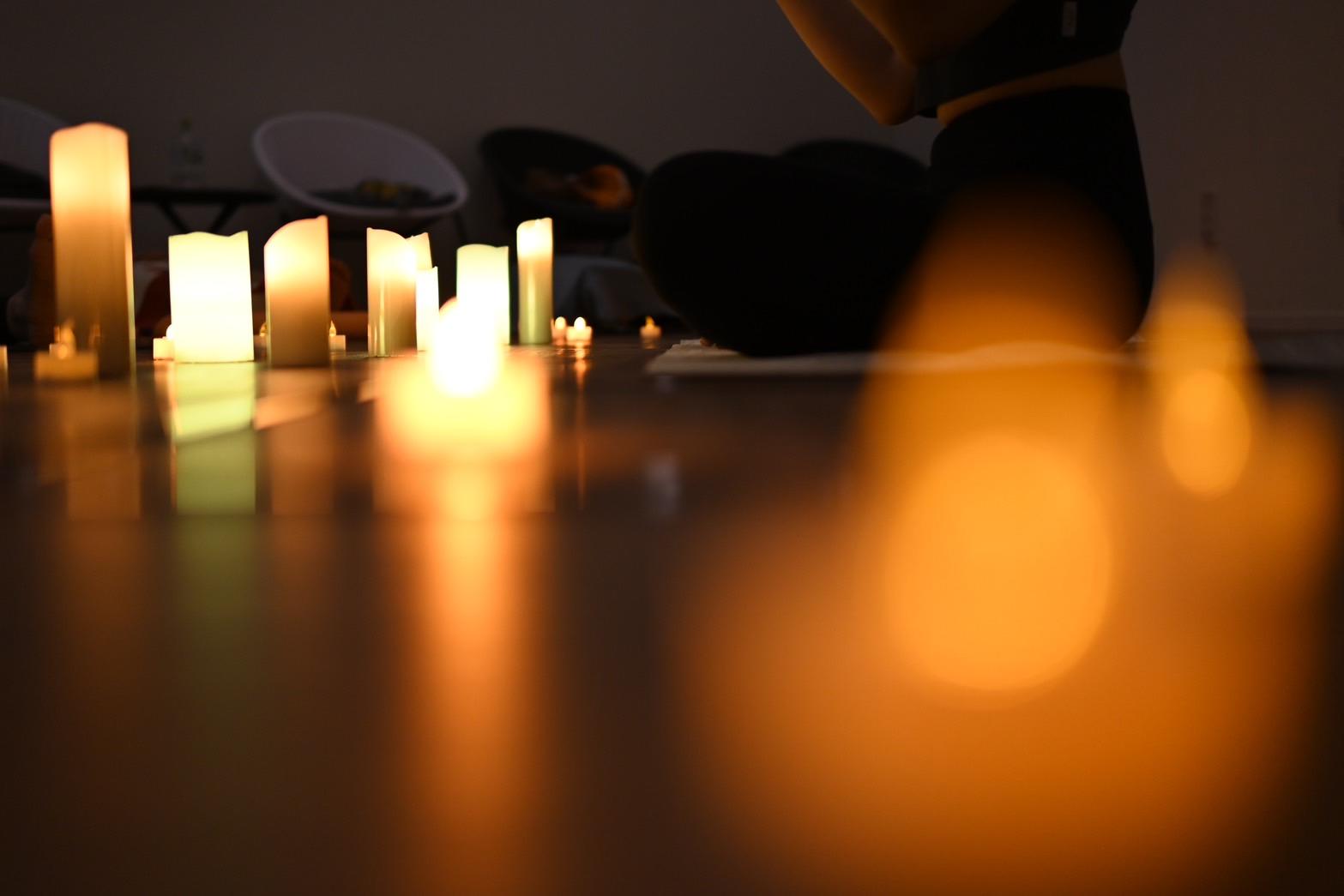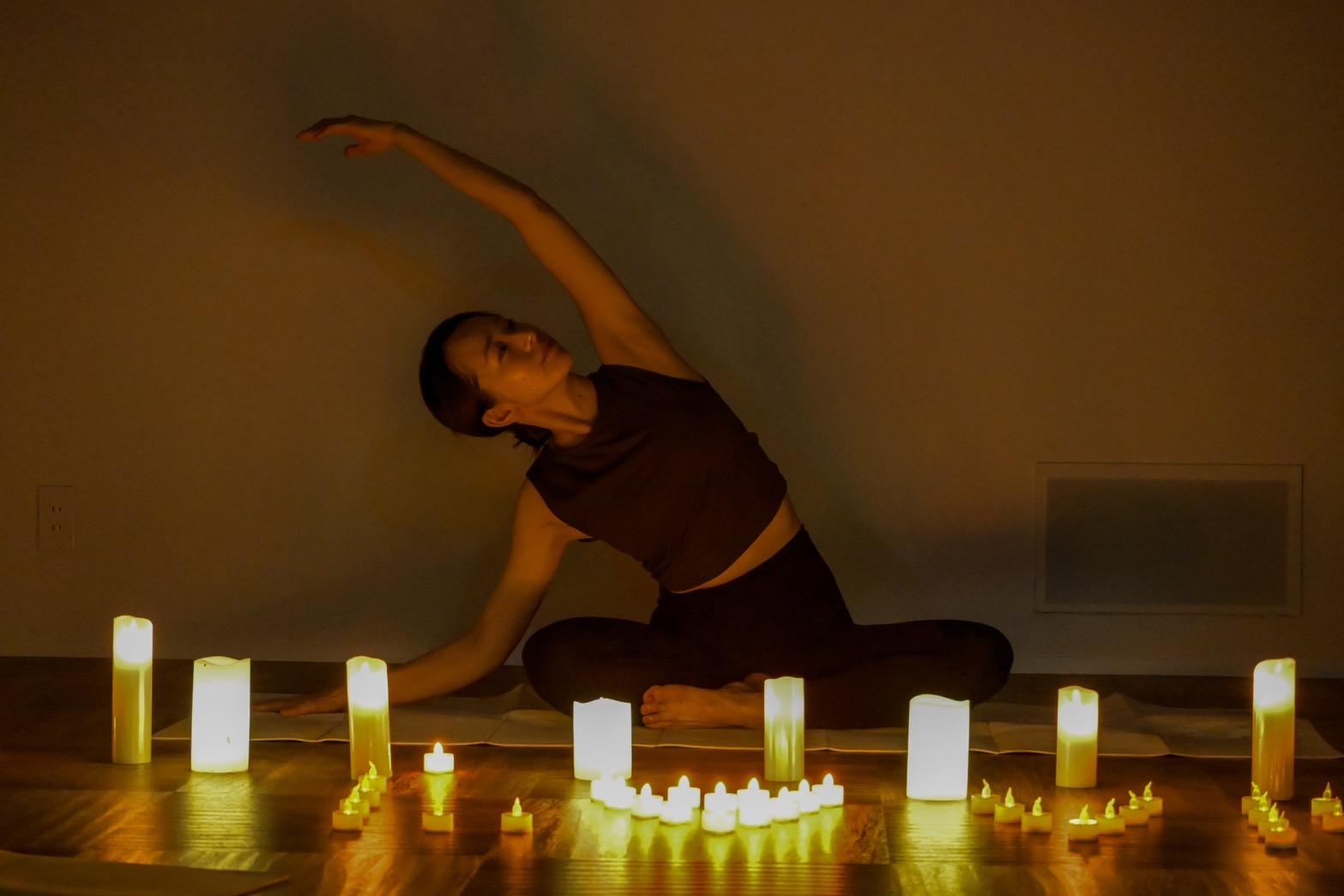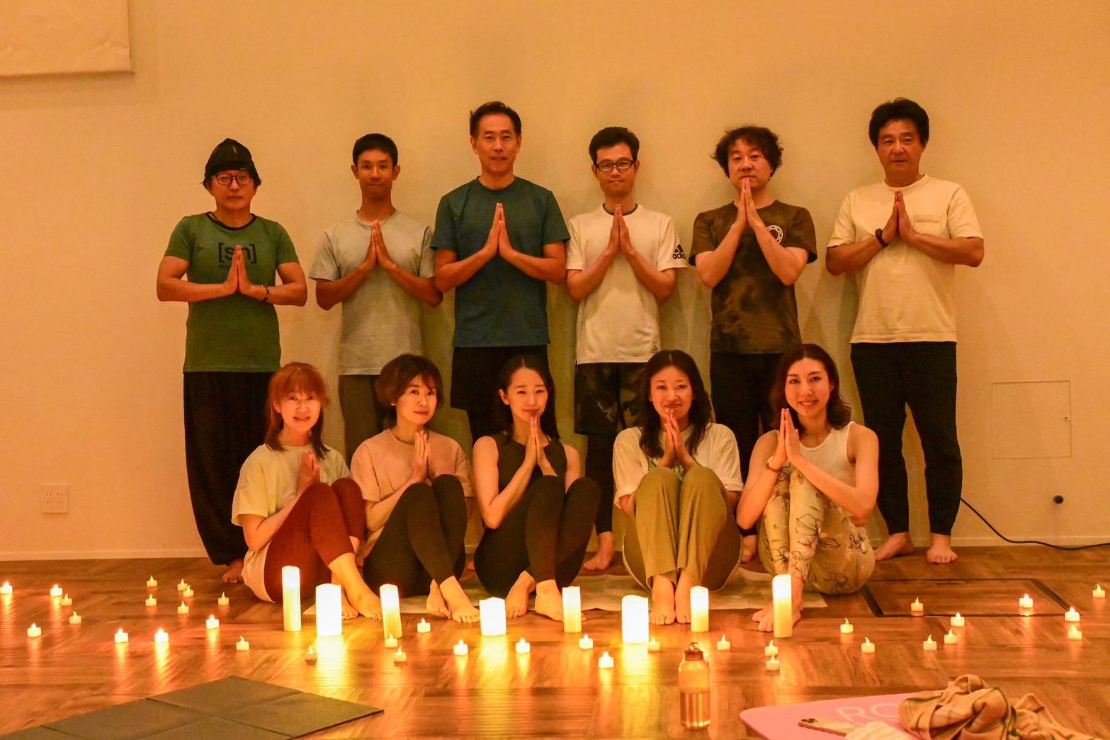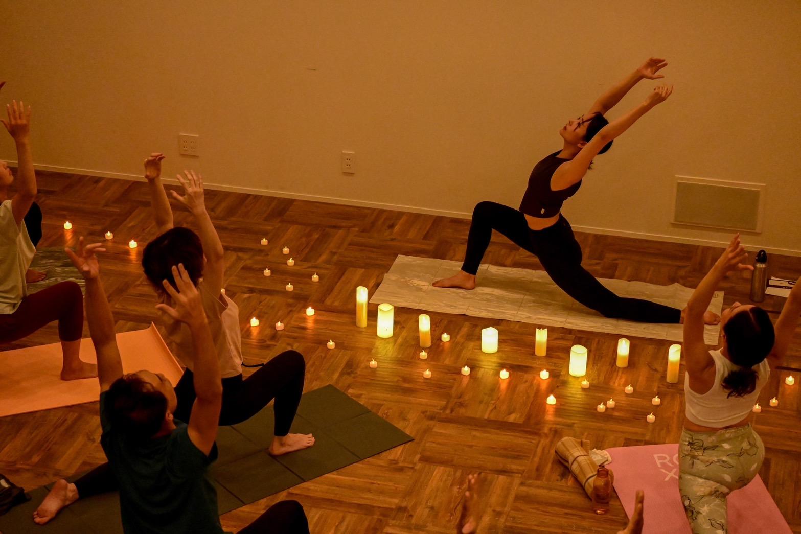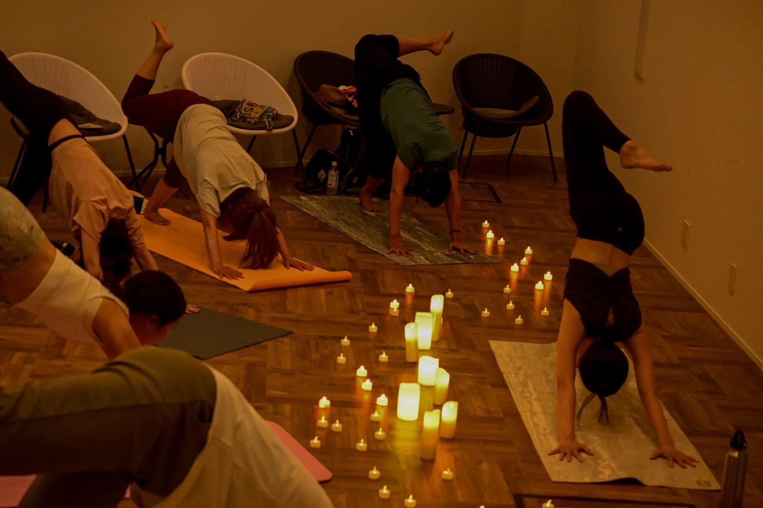 地下の「くらもとホール」で、キャンドルに囲まれヒノキのアロマを感じながらのヨガイベント。