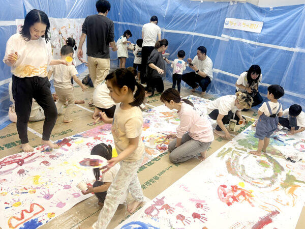 地下では、はちゃめちゃ絵の具遊びで子供たちが自由にのびのびと絵を描いてました。