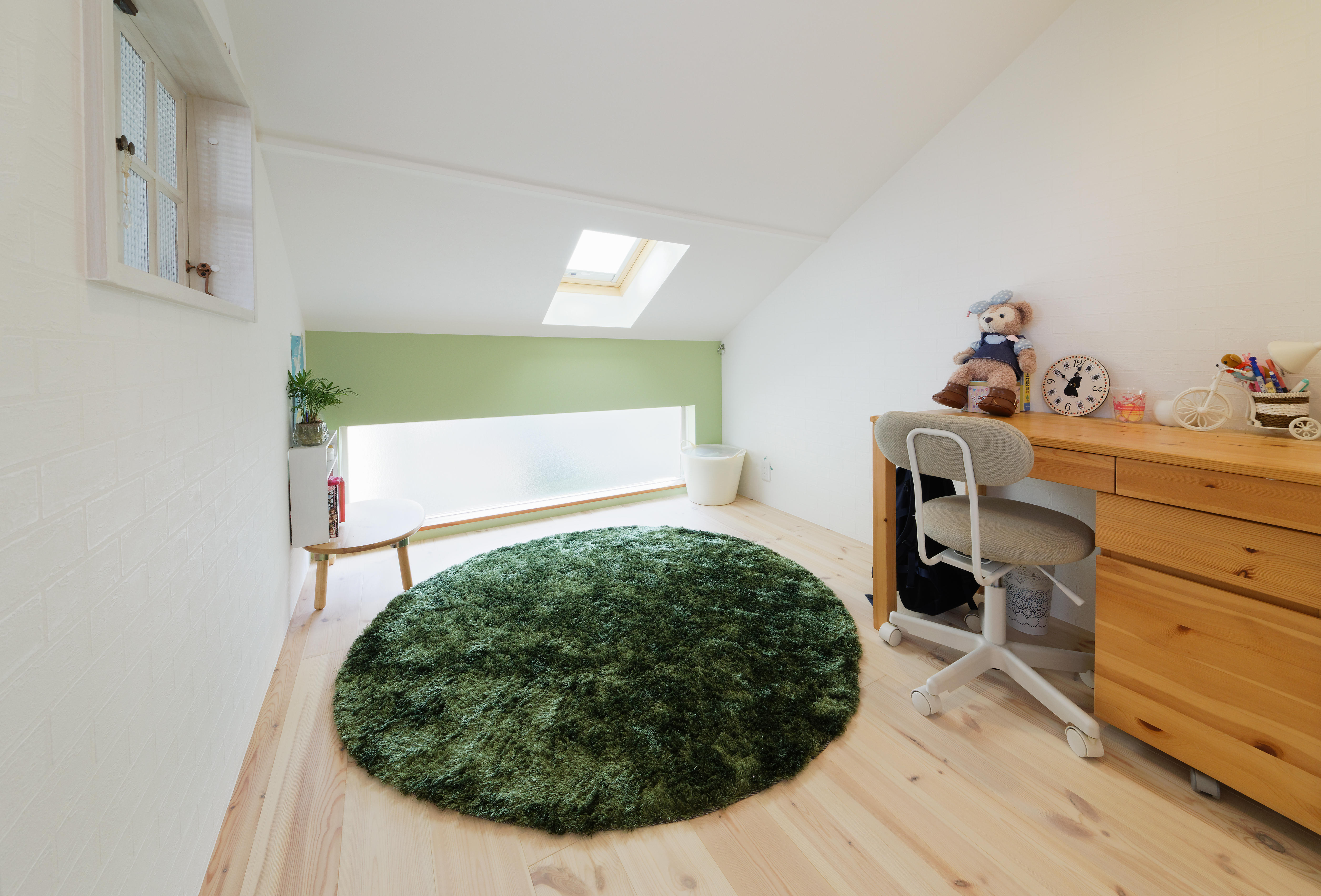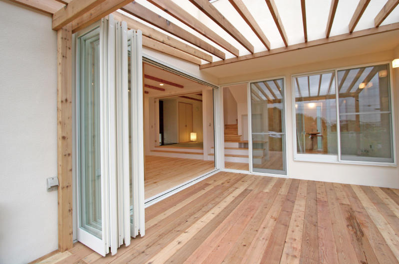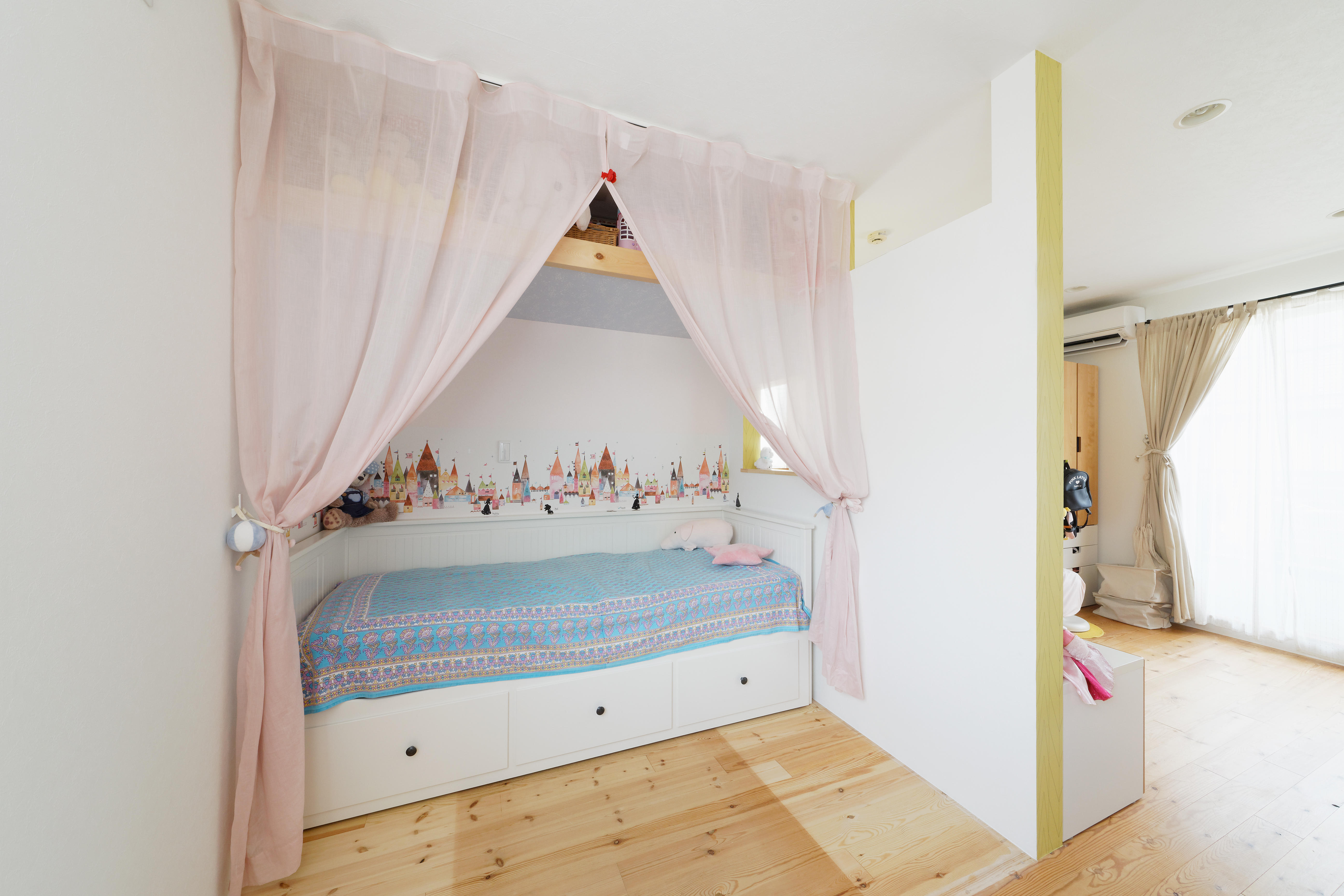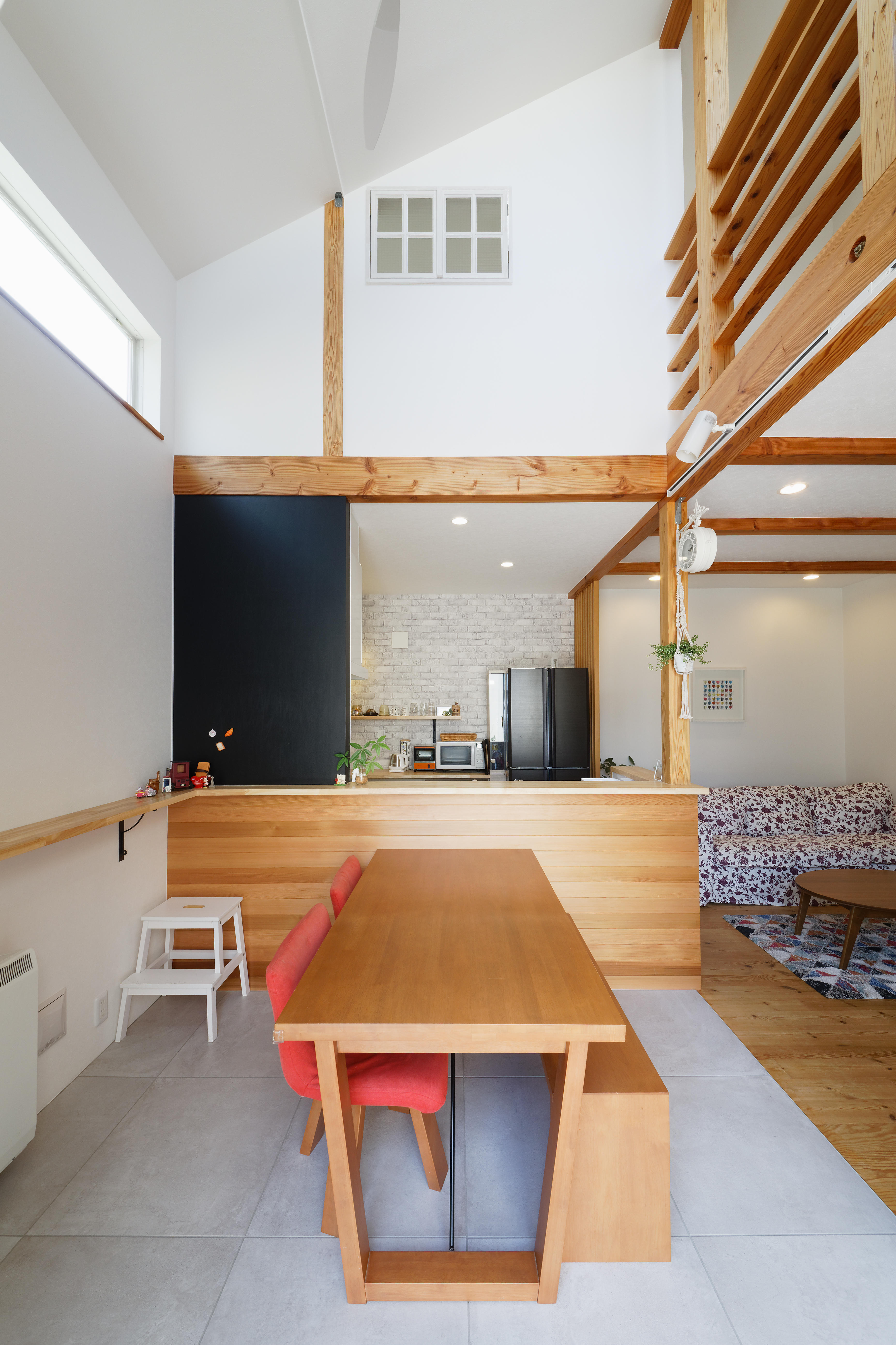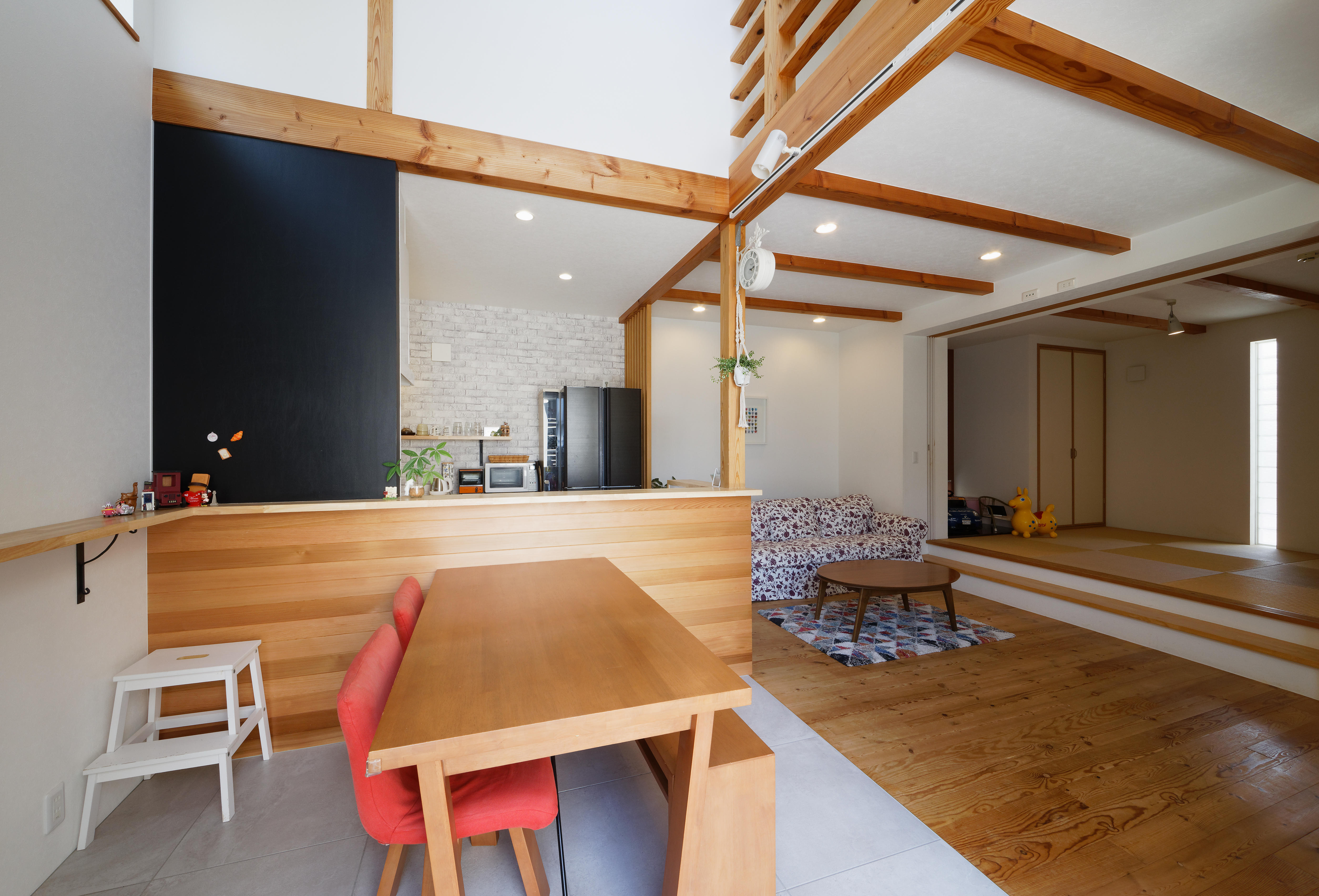10年前に弊社で建てた注文住宅をライフスタイルに合わせてリフォーム。大きな吹き抜けの一部を子ども部屋としてレイアウトを再構築し、家事の効率化をするためDKの配置を大胆に変更。リビングの床はパイン材、キッチンの床はタイルを使用し、汚れに強く掃除がラクに。キッチン前はマグネット黒板で遊び心をプラスし、みんなが快適に楽しく過ごせる家になりました。