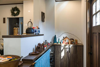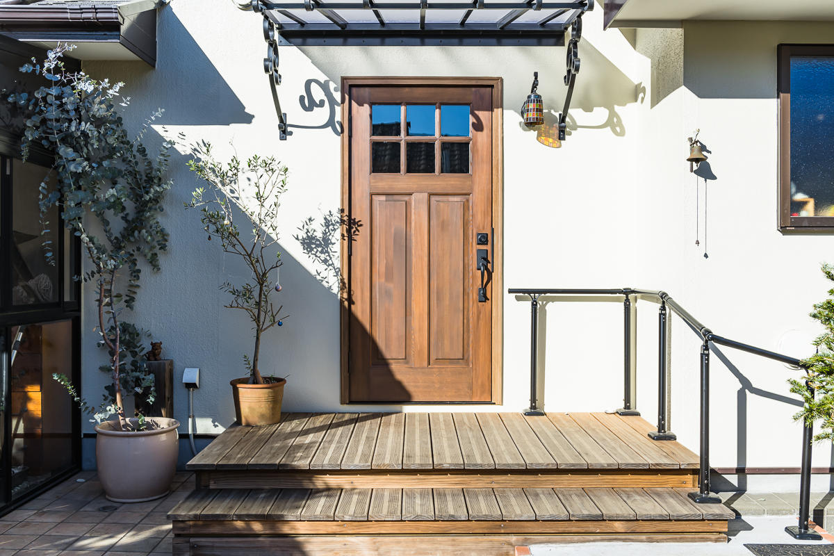お客様を迎える玄関ポーチはウッドデッキで、入口からアンティークな雰囲気をかもしだしています。