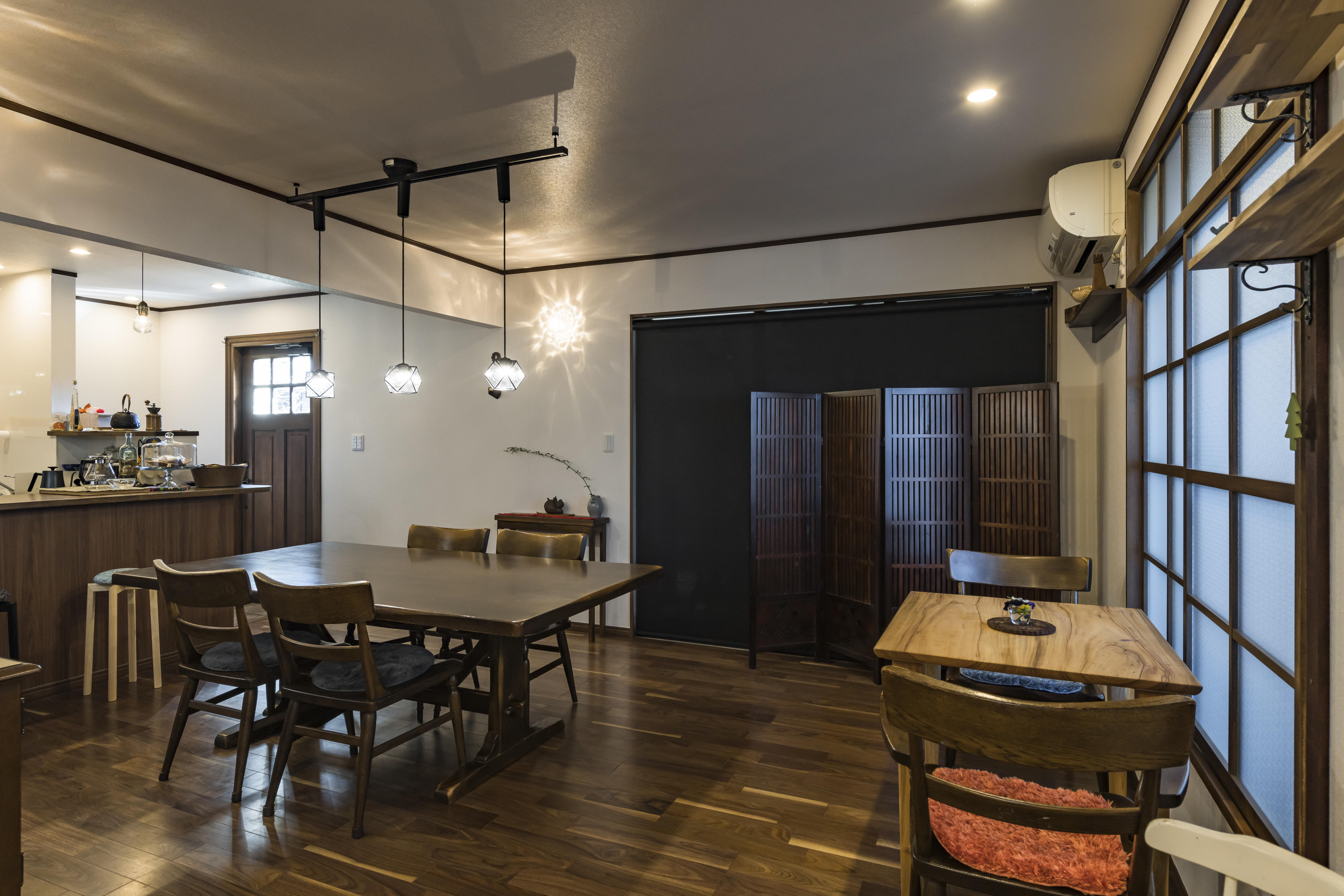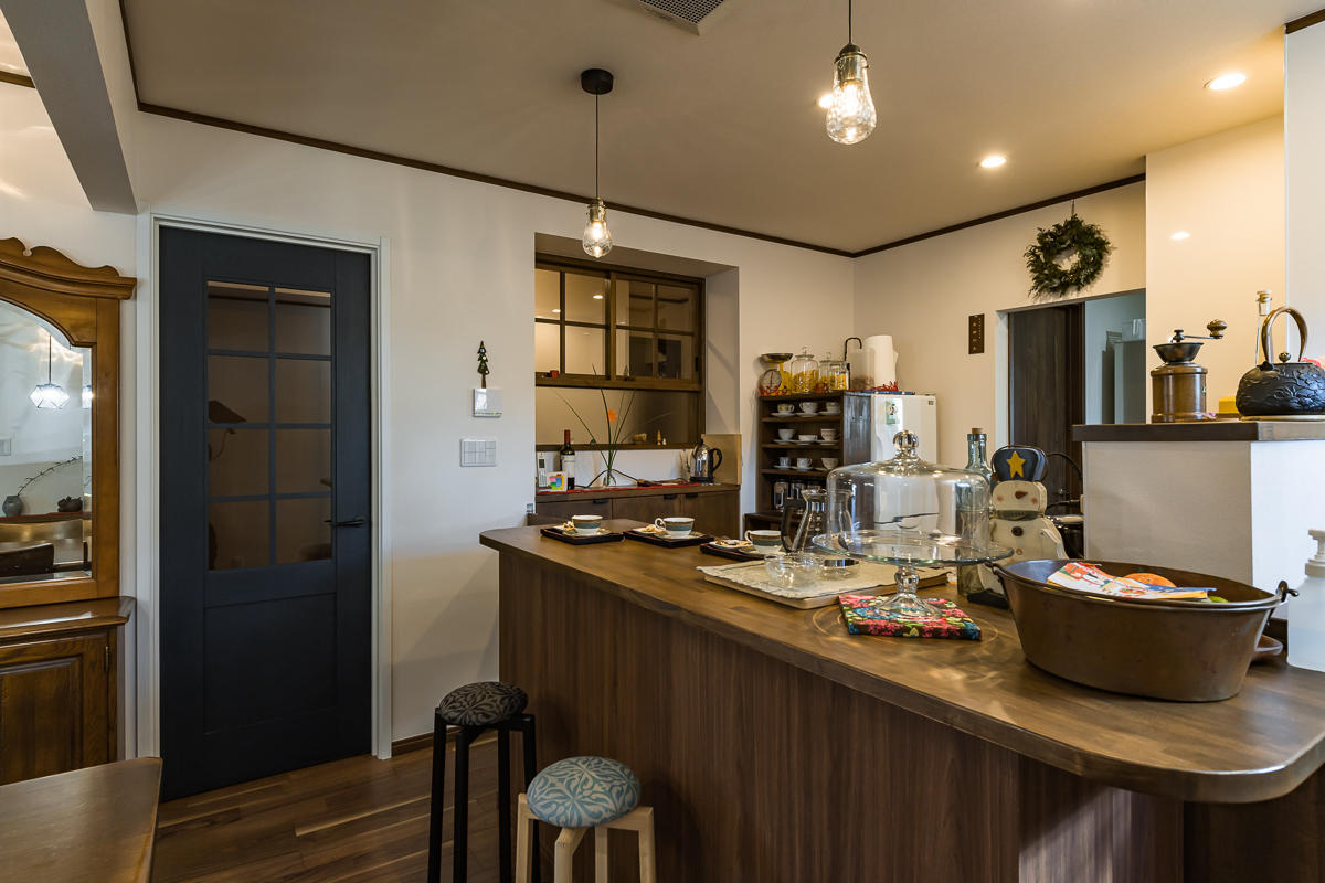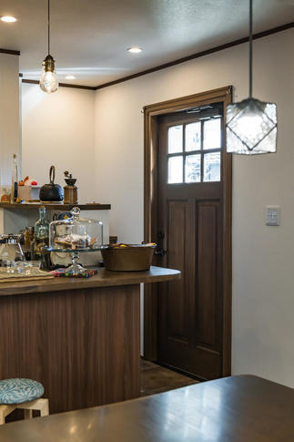 カフェカウンターや格子のデザインの窓は造作でこだわりのつまった空間となりました。