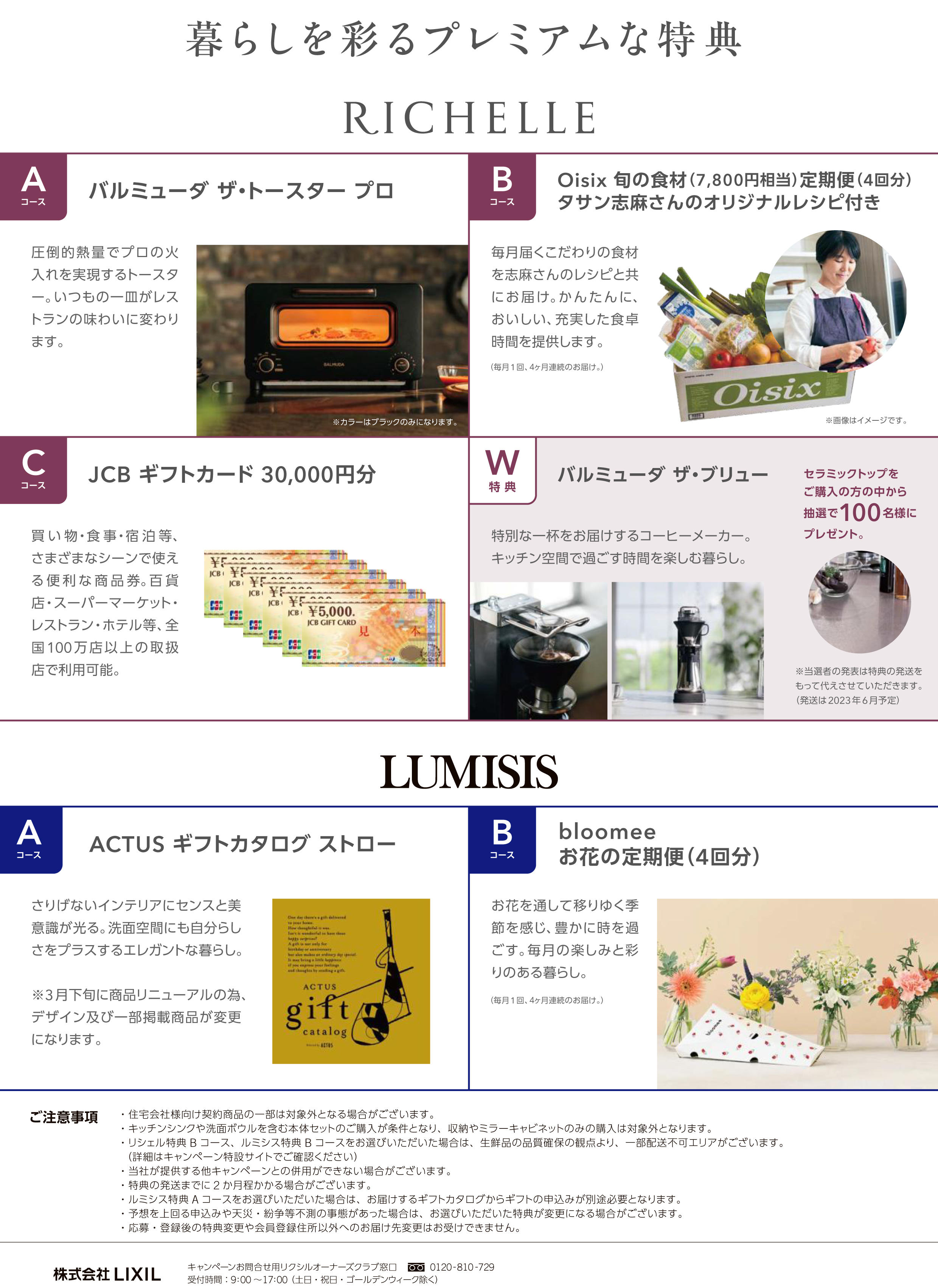下記のご成約期間中に対象商品を購入いただき、応募とリクシルオーナーズクラブの製品登録をしていただいた方に、もれなく暮らしを彩る商品をプレゼント!