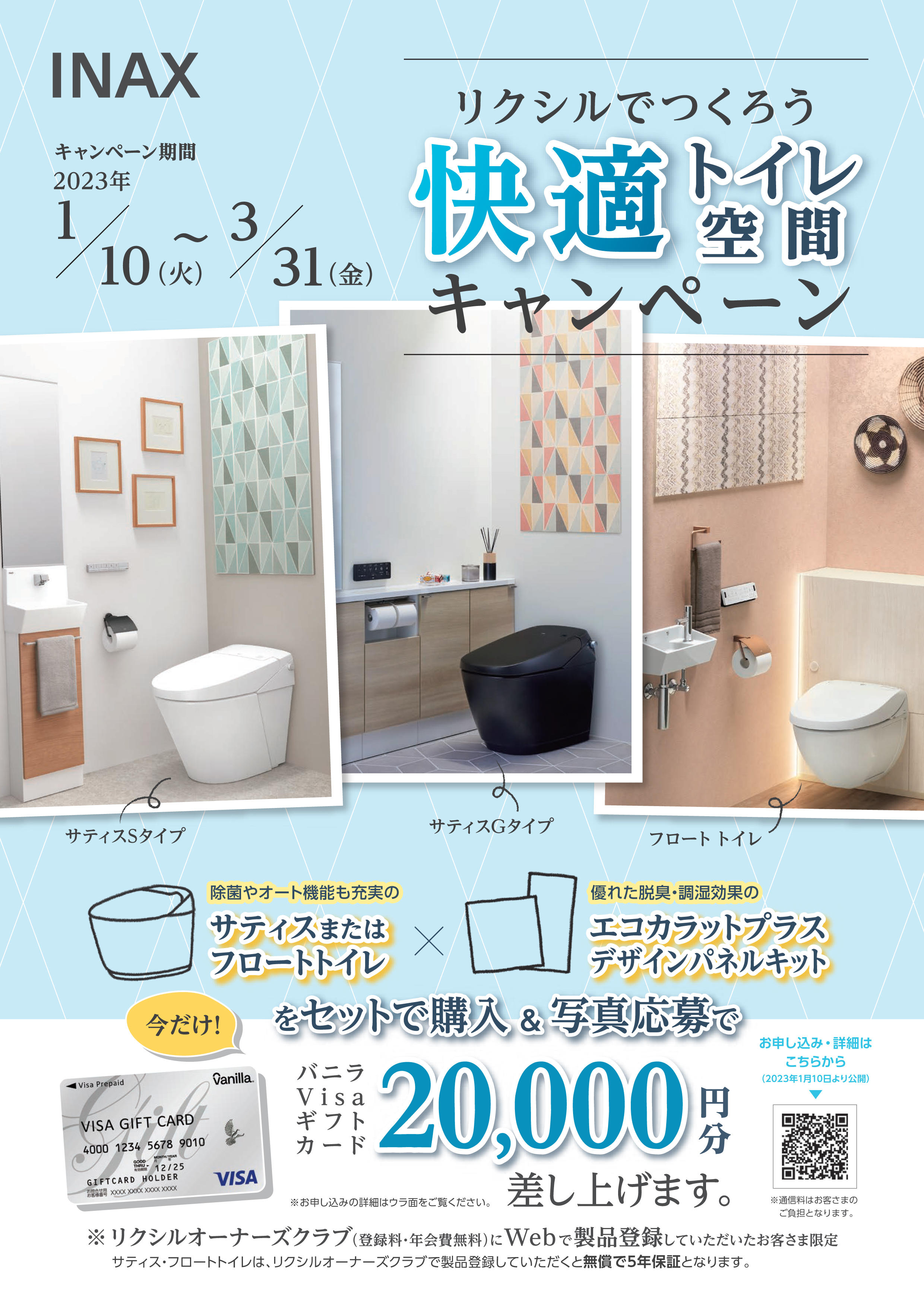 LIXILのトイレ(サティスまたはフロートトイレ)とエコカラットプラスのデザインパネルキットをセットでご購入いただき、写真応募いただきますとギフトカード20.000円分をプレゼント!!