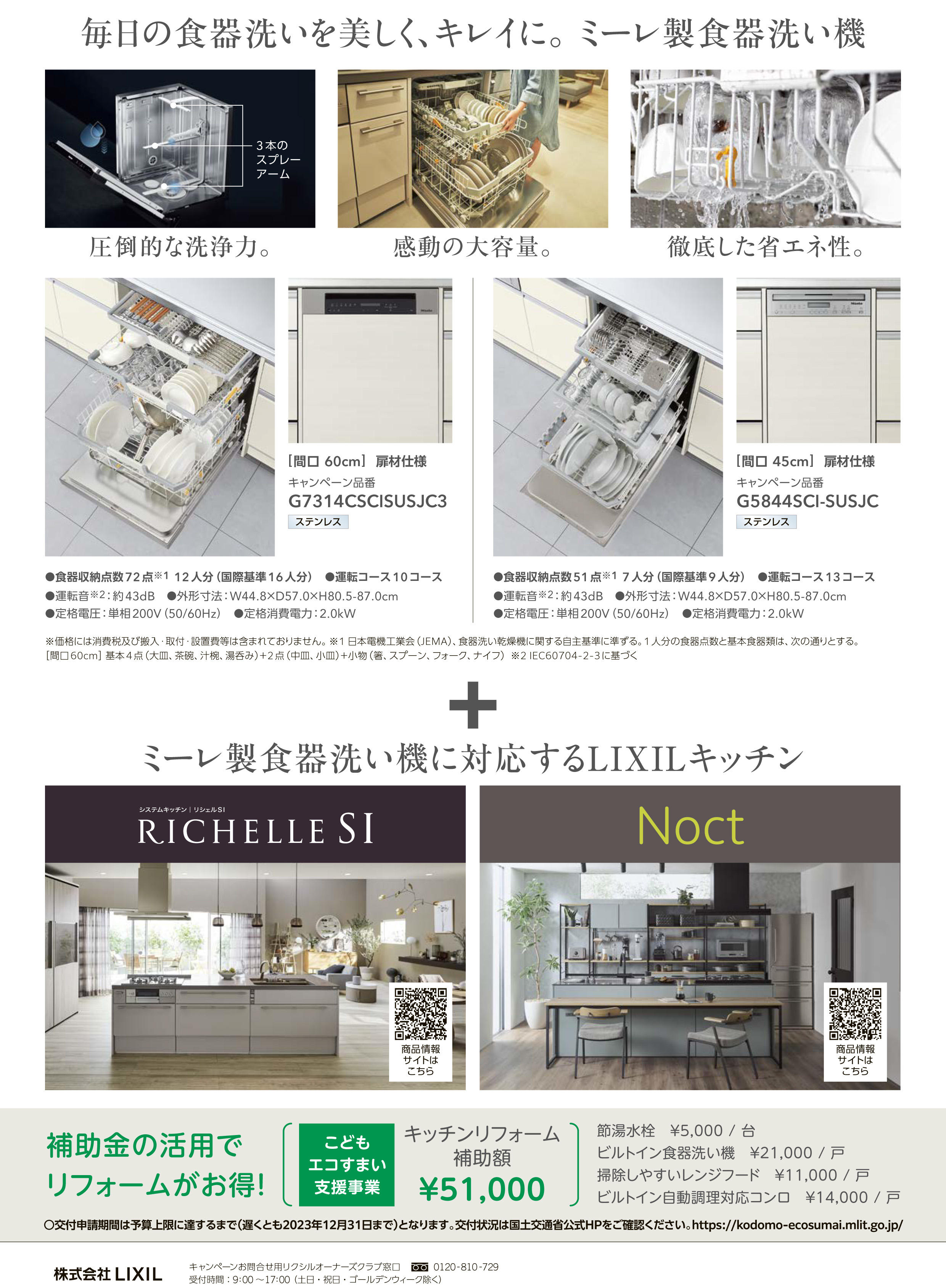 LIXILのキッチン(リシェルSIあるいはノクト)とミーレ製食器洗い機をセットでご成約いただくと、