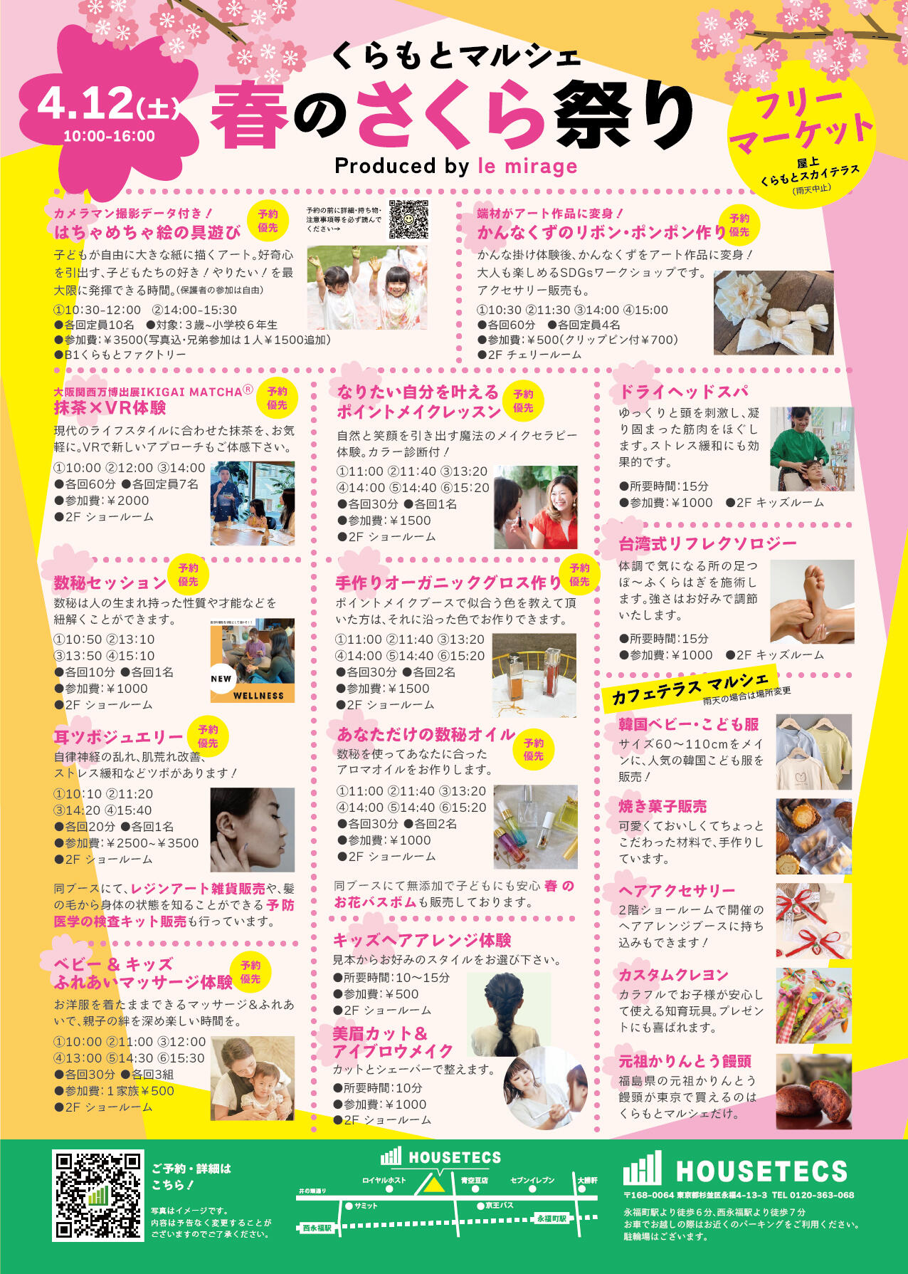 ハウステックス春のイベント「くらもとマルシェ」開催します!大人気の「木工教室」ははもちろん、充実の内容の「くらしのセミナー」。今回はバルーンアートもやってきます!前回の好評でした、Le Mirageプロデュースの「春のさくら祭り」も盛りだくさんの内容です。ぜひお気軽にご参加ください。みなさまのお越しをお待ちしております。(内容は予告なく変更することがございますのでご了承ください)