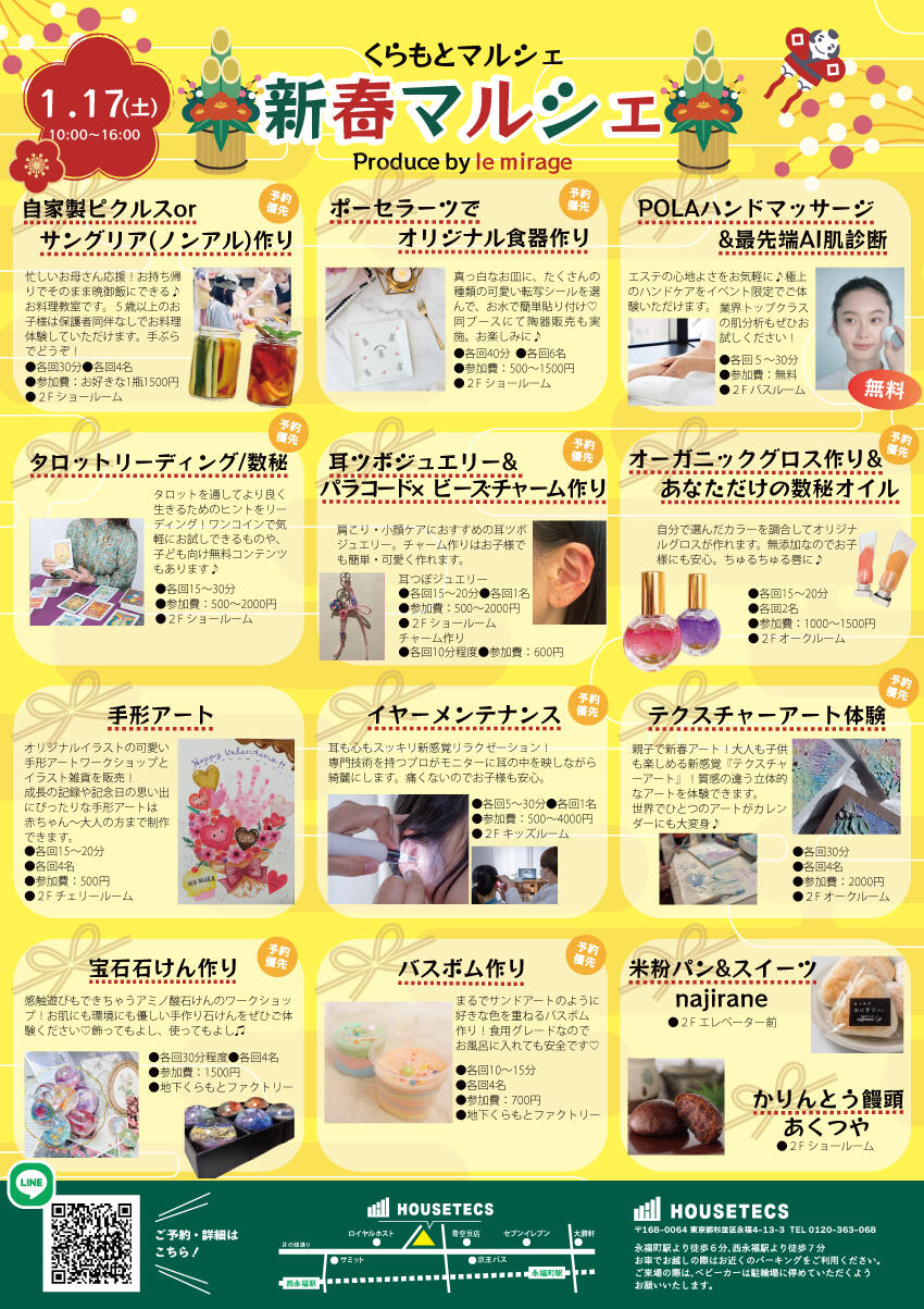 今年も「ハウステックス新春フェスタ」開催します!Le Mirageがプロデュースの「新春マルシェ」も楽しい企画が盛りだくさん!お楽しみに。(内容は予告なく変更することがございますのでご了承ください)