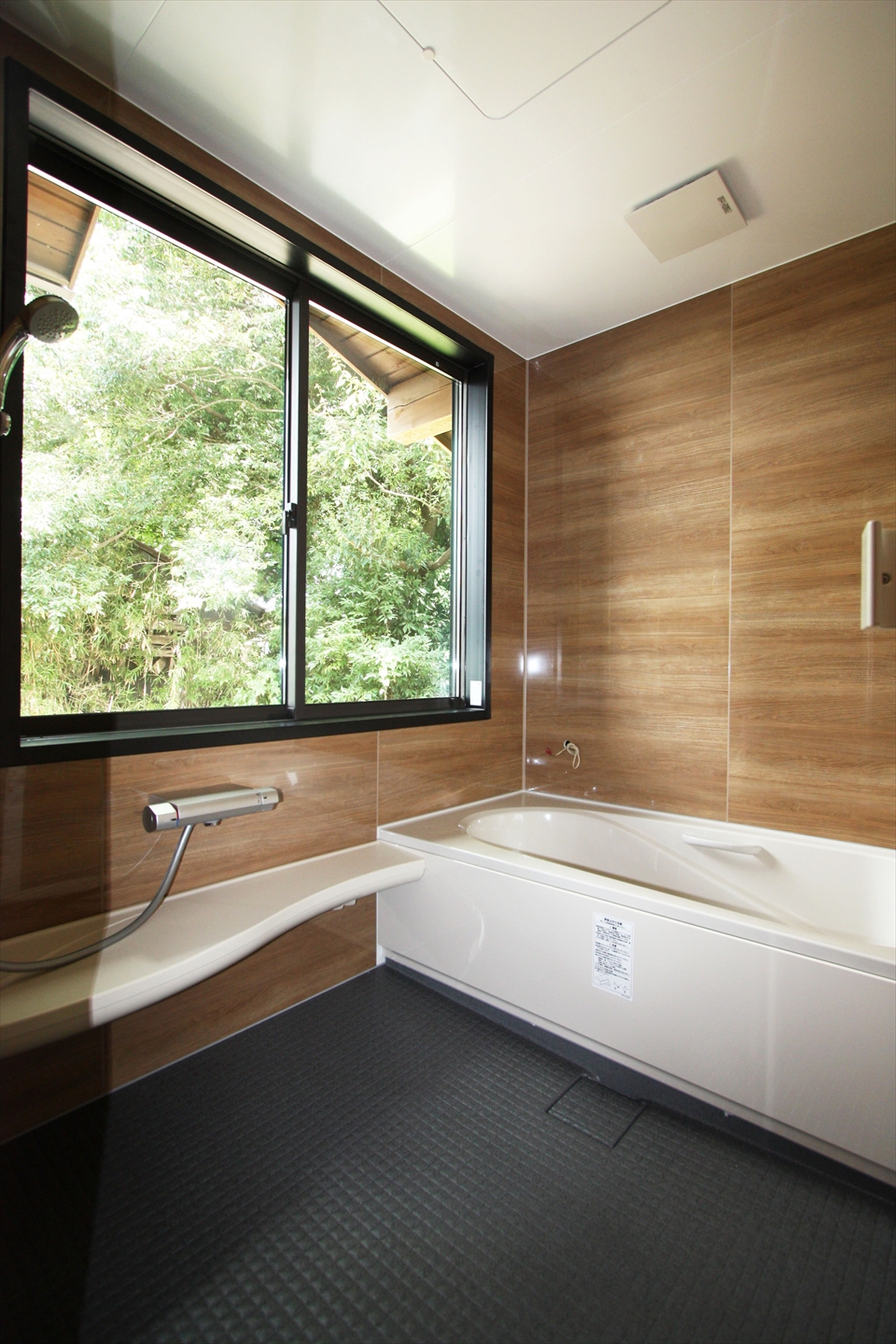木を貼り巡らせた前室のその先へ、一歩踏み入れた浴室の目前に広がる竹林の木漏れ日。