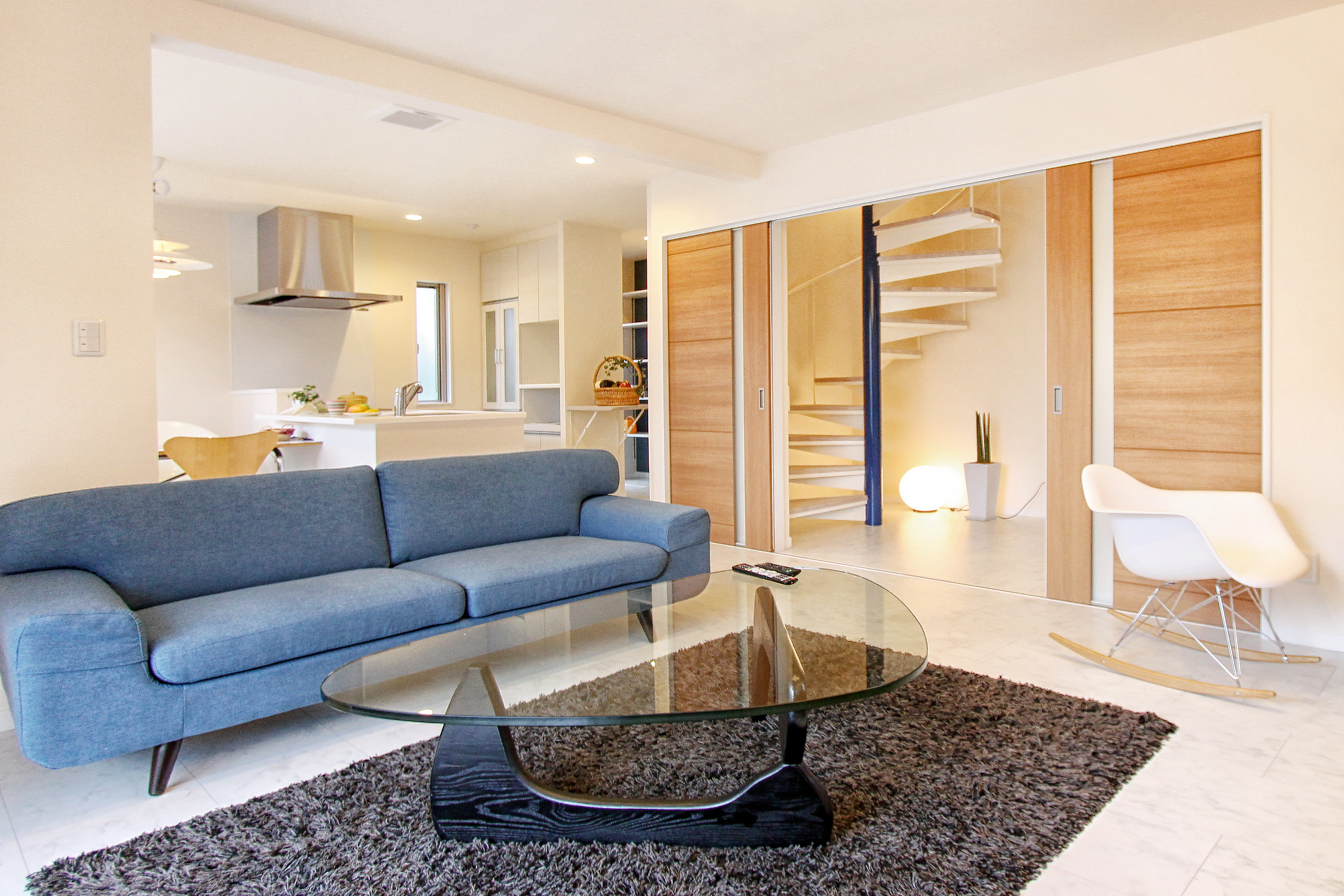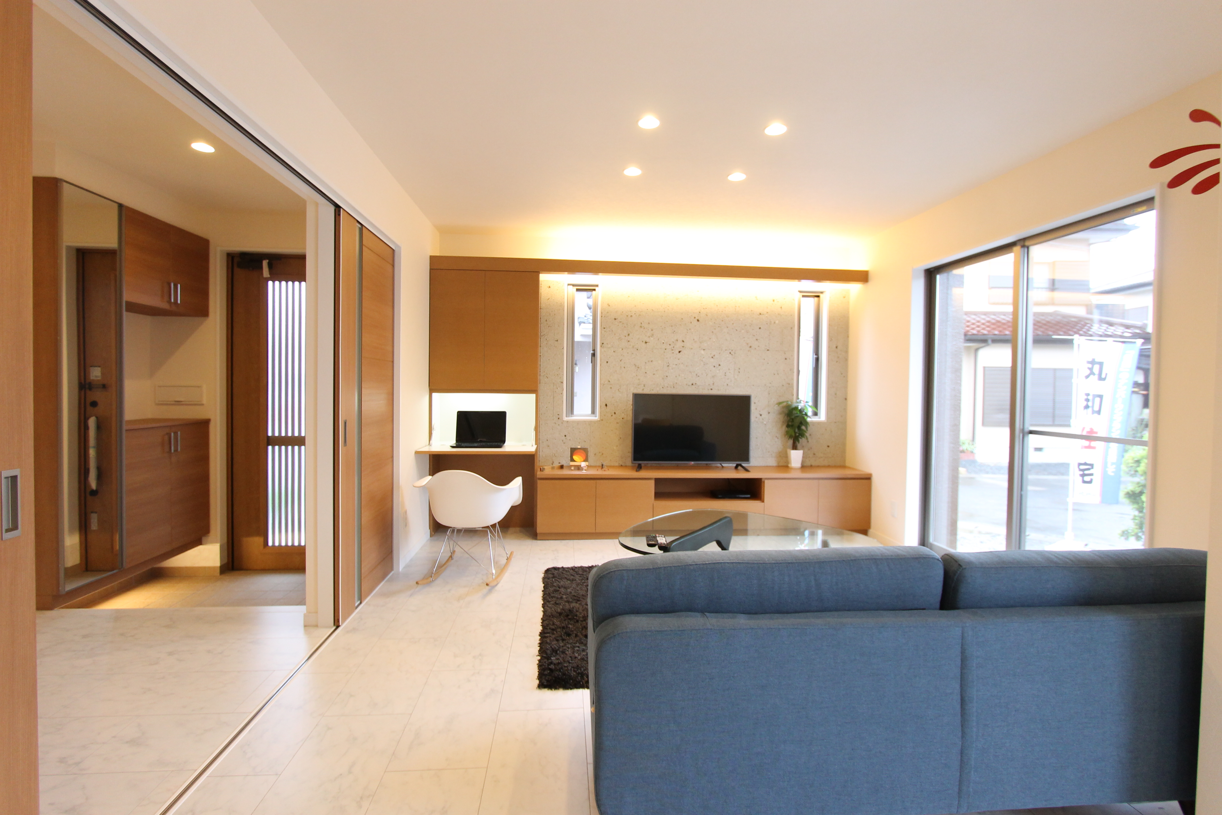 リビングは造作家具を設置することで収まりの良い空間に。ライティングデスクもあるのでパソコンなどはこの場所で。壁面には地元栃木県産の大谷石を使用し、間接照明との融合を図りました。照明の優しい光が大谷石を更に美しく引き立たせます。
