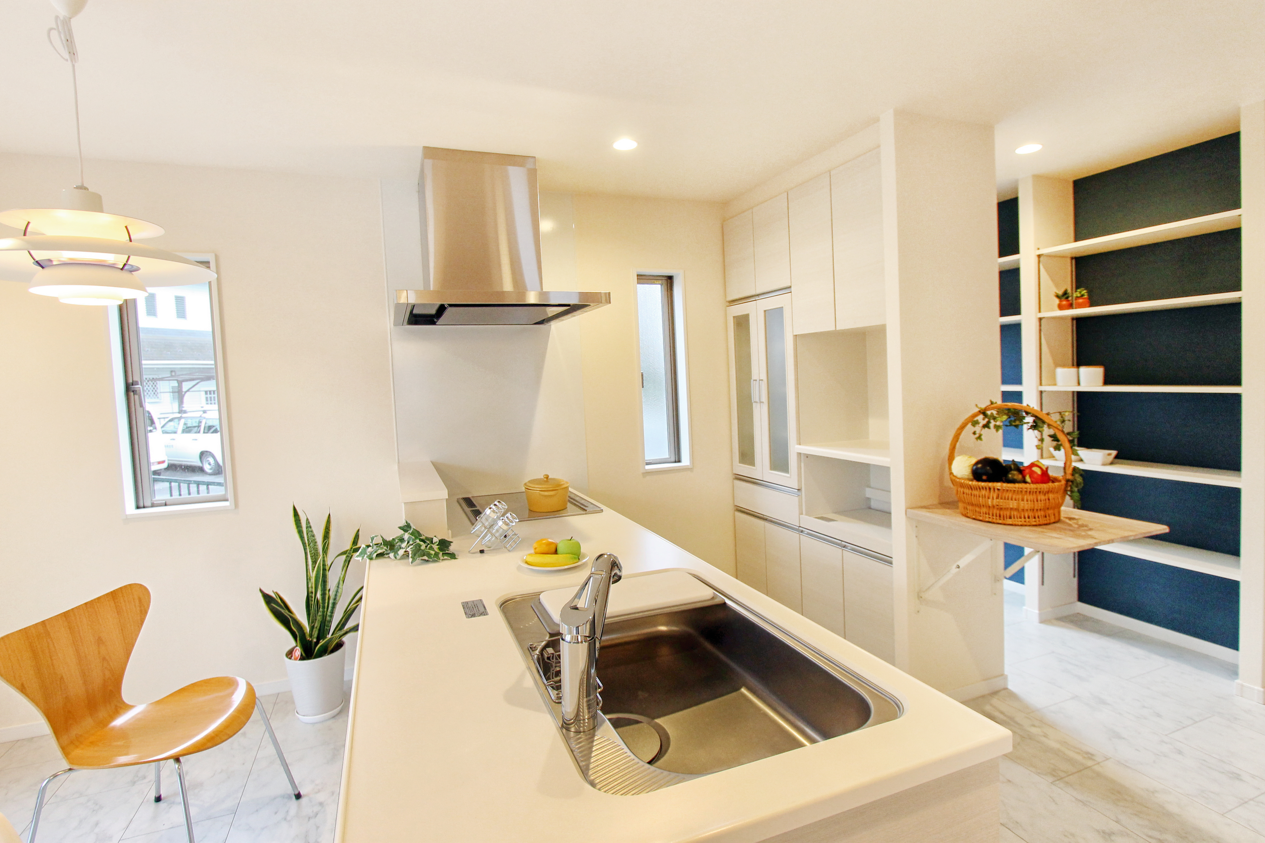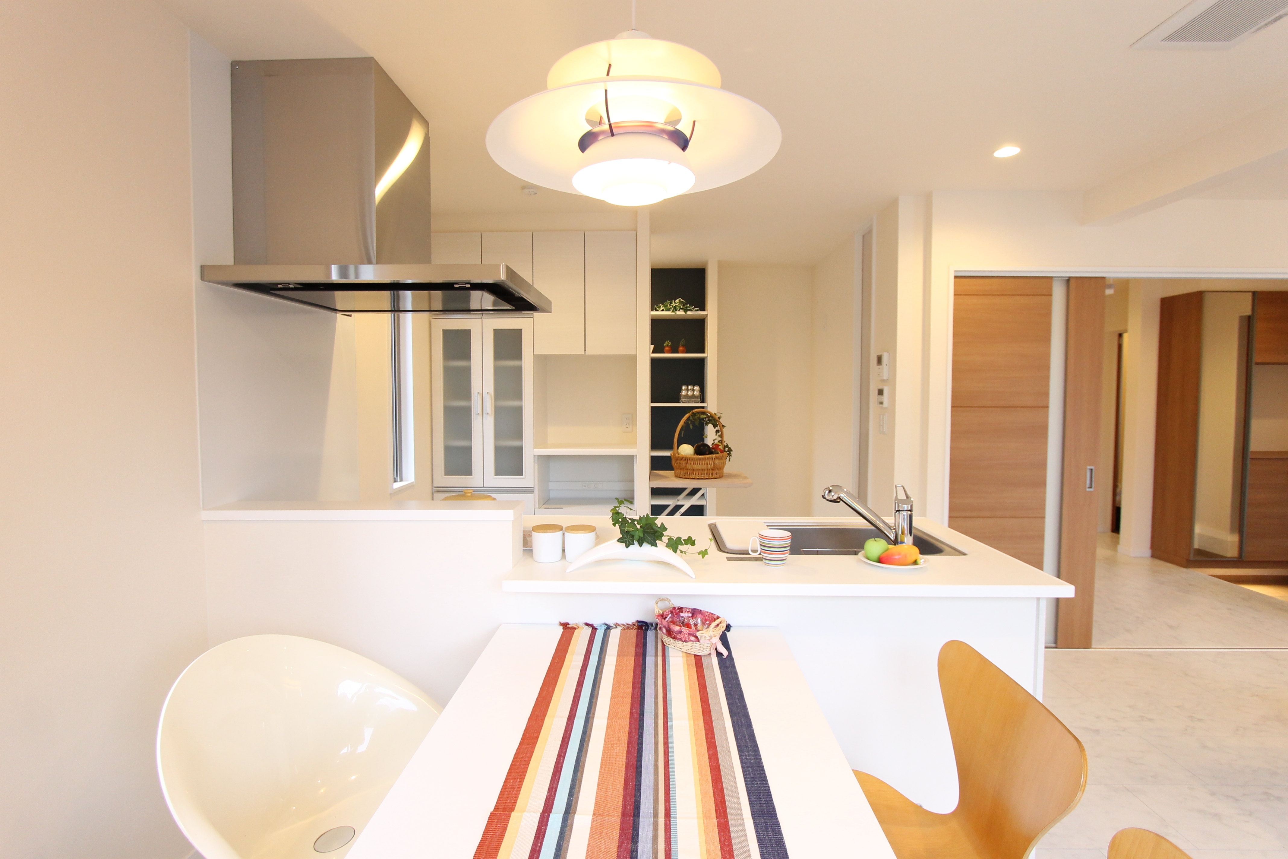 壁付式から対面キッチンに変更。家族で会話をしながら料理を楽しむことが出来ます。キッチンの背面にはパントリーを新しく設置し、食品やキッチン用品の収納に大活躍します。作業スペースが足りないときは、折りたたみ式のアシスタントテーブルがあるので安心。使わないときはたたんでおくことが出来るので便利です。