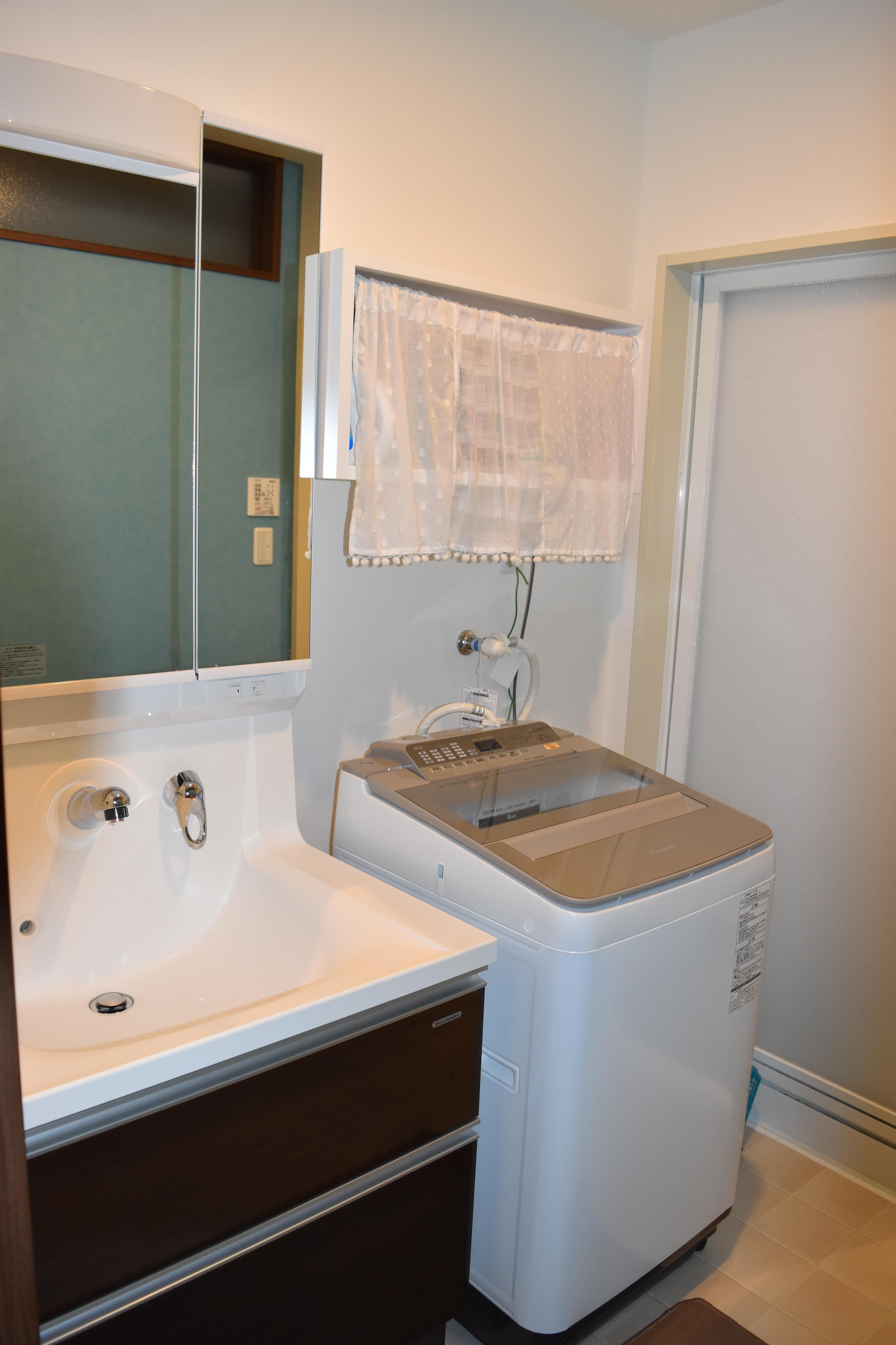 洗面化粧台の収納は引き戸にし、取り出しやすくしました。三面鏡の裏にも収納ができ、見た目スッキリ!