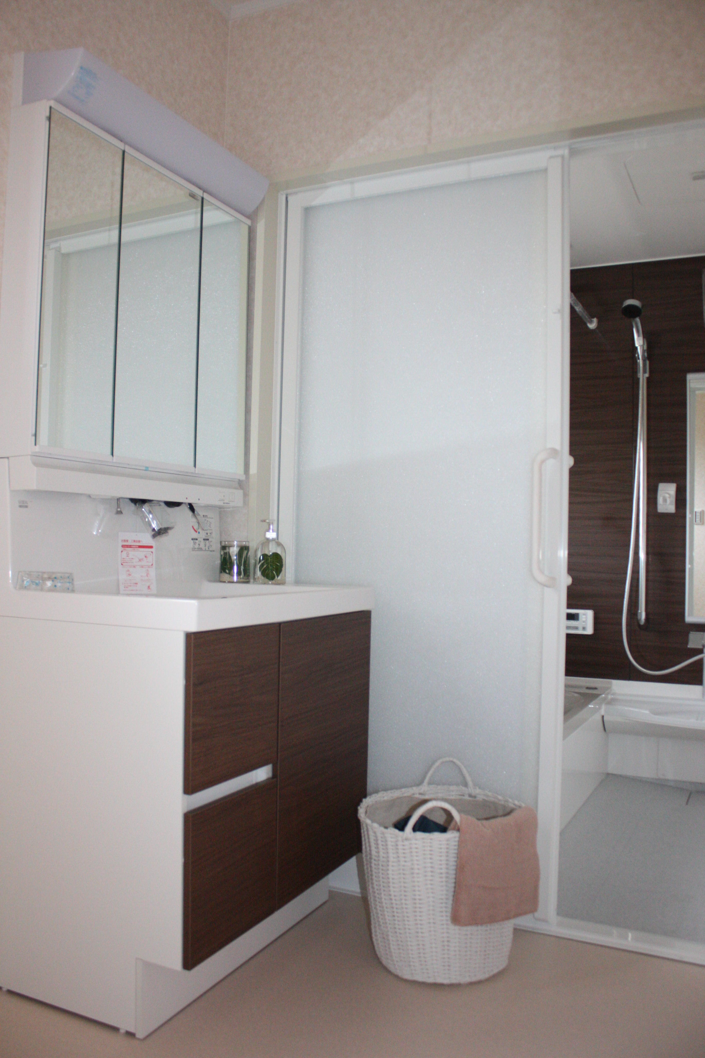 狭かった水まわりスペース・・・。リフォームで洗面室、浴室共に1坪に変更し広々とした空間に!統一感のある色でまとめてシックな雰囲気に。