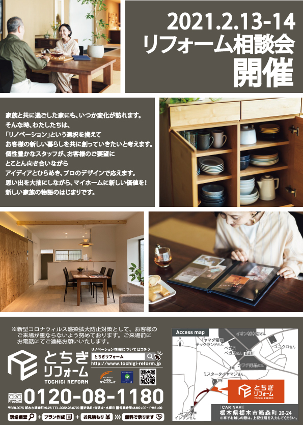 漠然と抱く「住まいの今後」を建築家がカタチにしていきます。 最初から明確に「こうしたい!」が無くても大丈夫。 私たちがお手伝いいたします。 それぞれ違う思いに、たくさんの住まいを作ってきた建築家が応えます。 もちろん、ご相談は無料。 新しくなったショールームで、建築家がお待ちしております。 実際に手に触れて、体験できるショールームに遊びに来てください。 ※※※※※新型コロナウィルス感染拡大防止のために※※※※※ とちぎリフォームでは、新型コロナウィルス感染拡大防止のため、 また外出に不安のあるお客様のために、オンラインによるご相談も承っております。 下記イベント予約ボタンの備考欄に「オンライン相談希望」とご記入いただき お申し込みをお願い致します。 追ってオンライン相談URLをお送りいたします。
