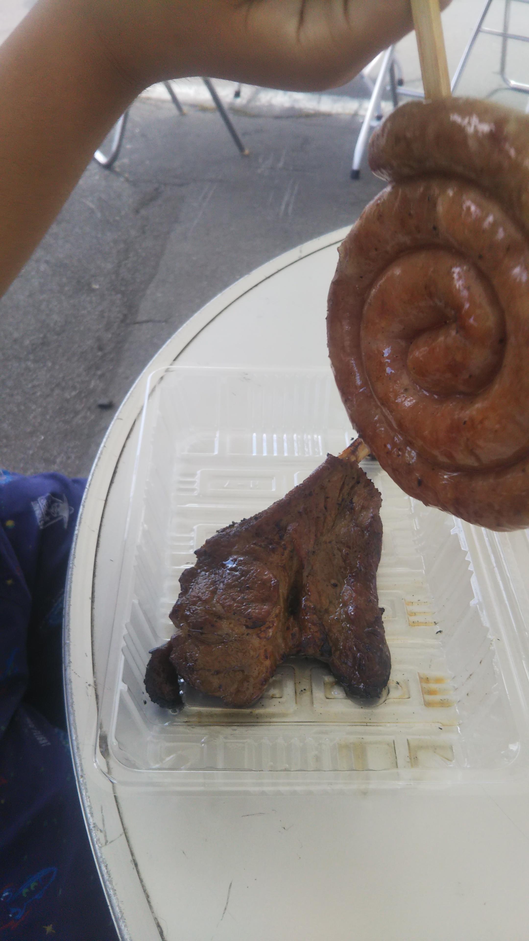 店舗前で焼いていた松尾ジンギスカンの骨付きラムステーキを食べ(手前のはぐるぐるウインナーです)