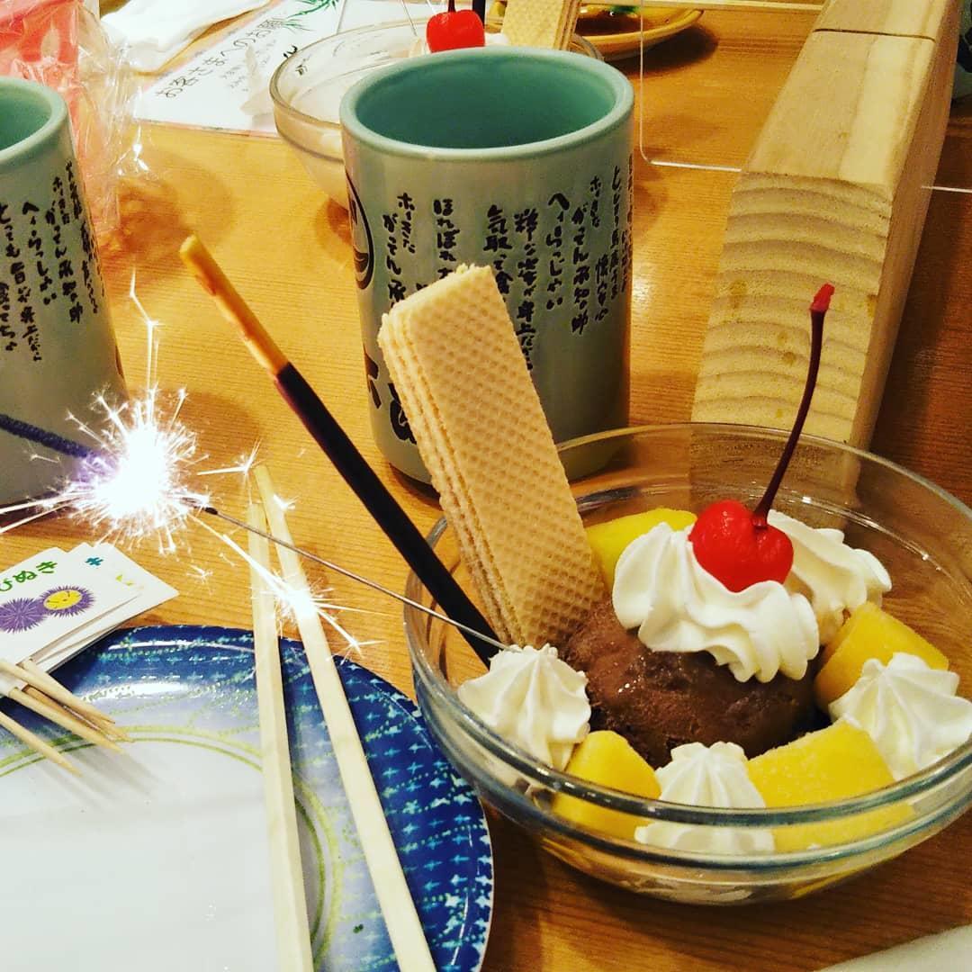 お店の方々がお歌でお祝いしてくださり、デザートのアイスには花火!!
