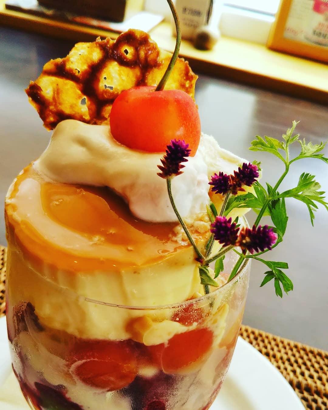 七重浜の珈琲待夢さんで「さくらんぼとプリンのパフェ」です。