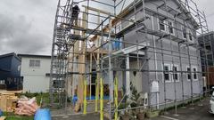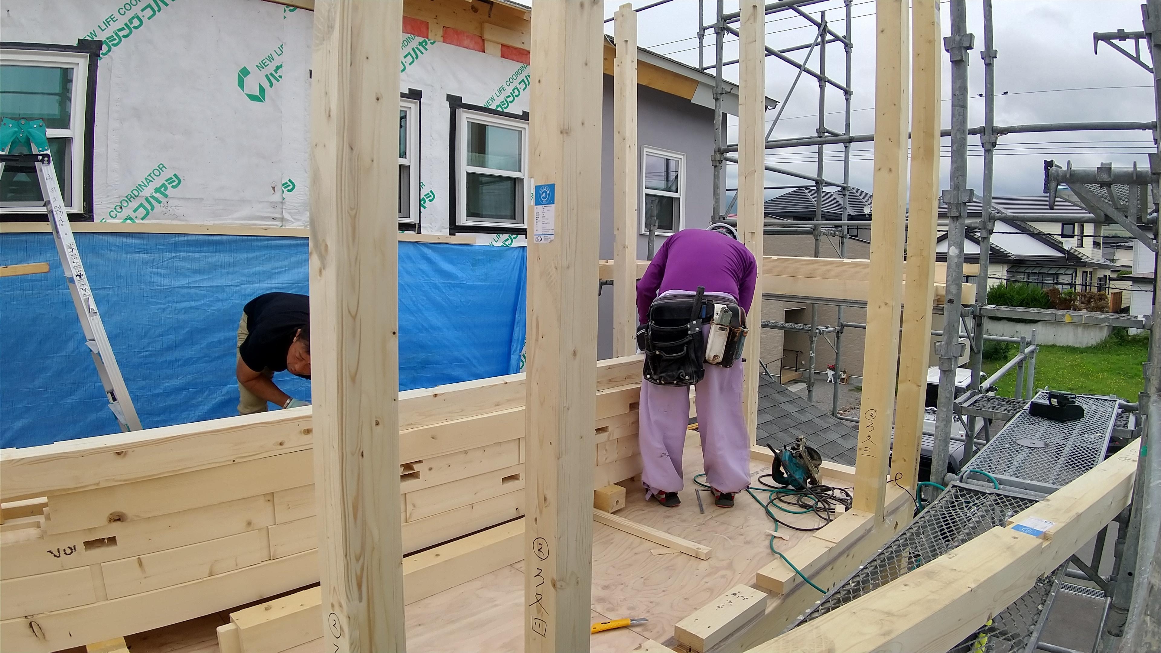 写真は増築部分の骨組みとなる構造材の建て込み風景です
