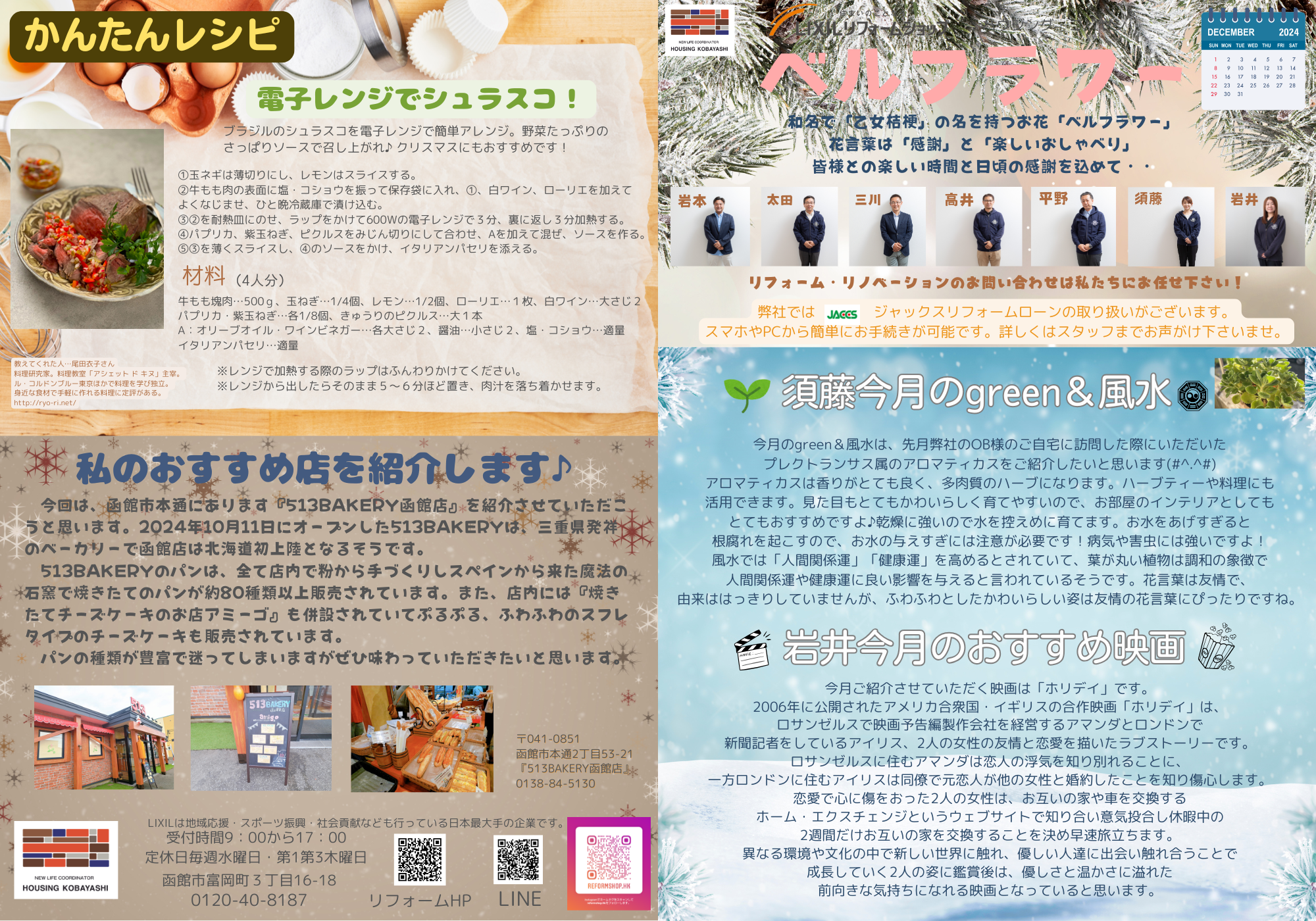 住まいメイトが手作りしているニュースレター「ベルフラワー」の12月号が完成いたしました(*^^*)施工事例や暮らしのちょっとした豆知識、かんたんレシピなど様々な情報を載せております♪