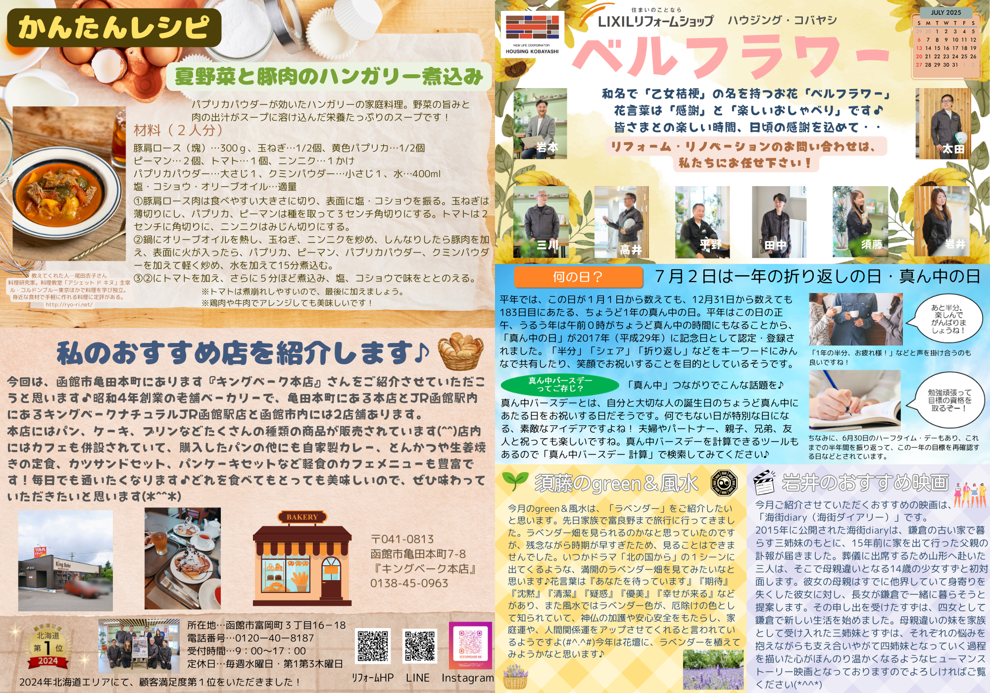 住まいメイトが手作りしているニュースレター「ベルフラワー」の7月号が完成いたしました!施工事例や暮らしのちょっとした豆知識、かんたんレシピなど様々な情報を載せております♪