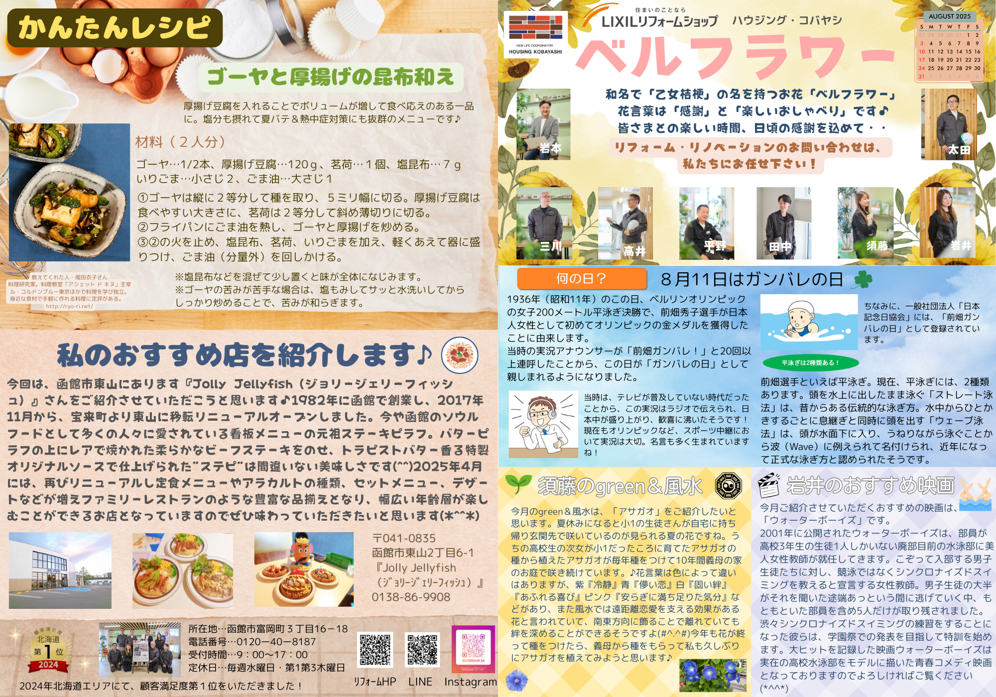 住まいメイトが手作りしているニュースレター「ベルフラワー」の8月号が完成いたしました!施工事例や暮らしのちょっとした豆知識、かんたんレシピなど様々な情報を載せております♪