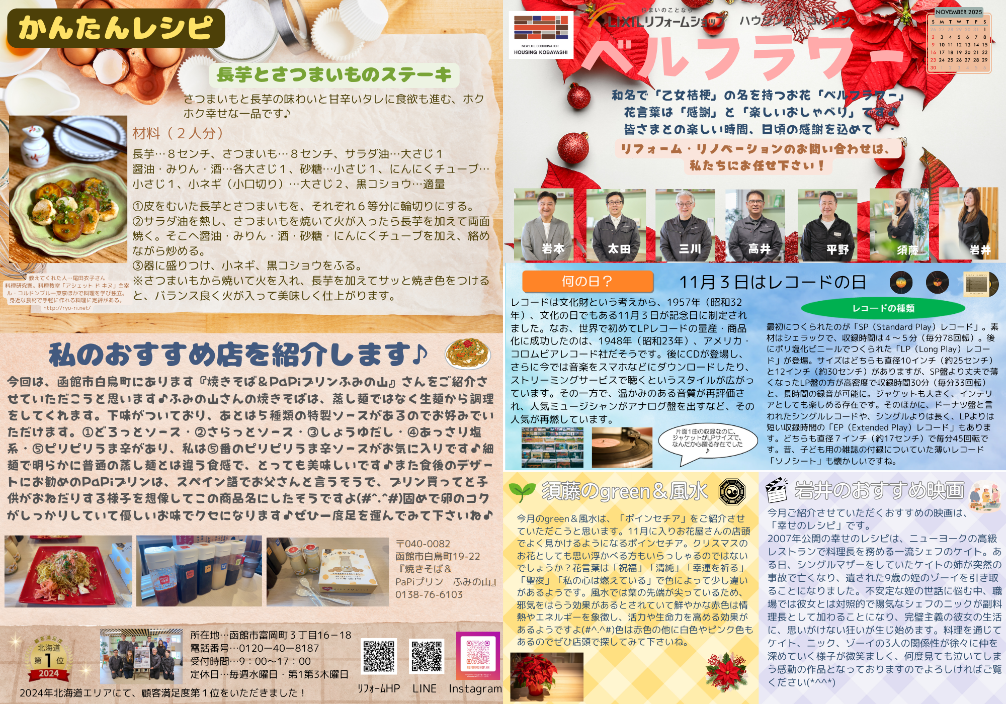 住まいメイトが手作りしているニュースレター「ベルフラワー」の11月号が完成いたしました!施工事例や暮らしのちょっとした豆知識、かんたんレシピなど様々な情報を載せております♪