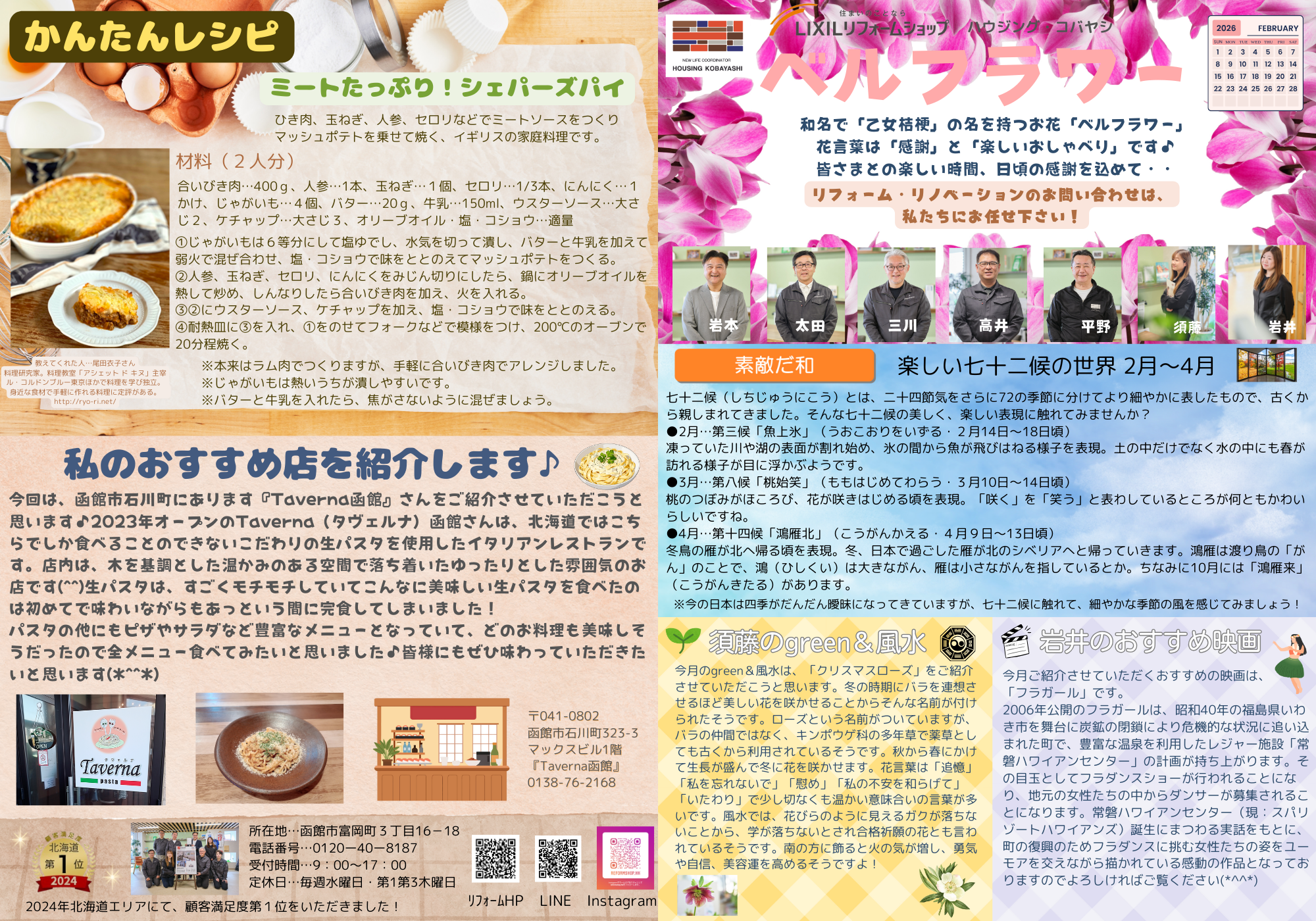 住まいメイトが手作りしているニュースレター「ベルフラワー」の2月号が完成いたしました!施工事例や暮らしのちょっとした豆知識、かんたんレシピなど様々な情報を載せております♪