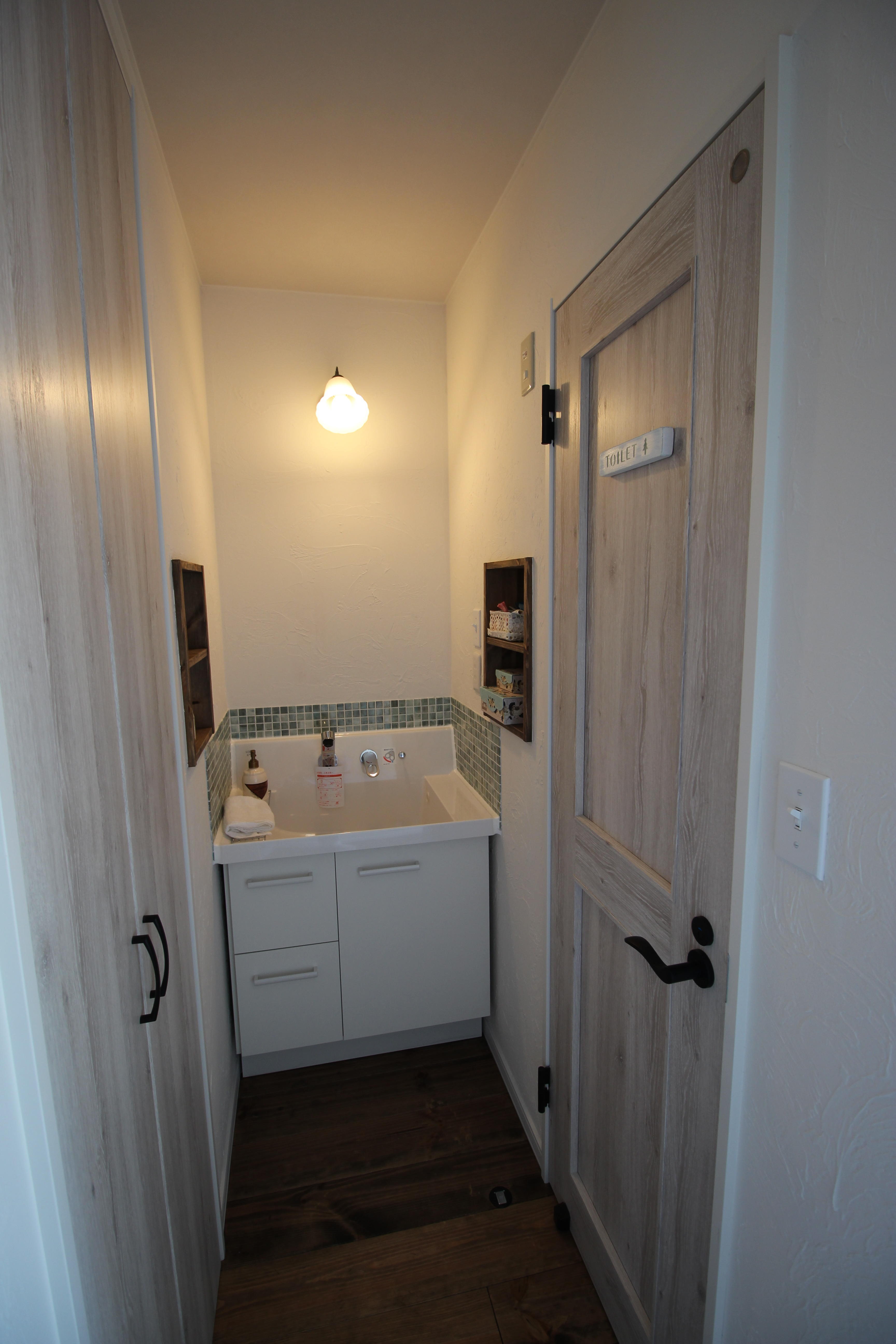 機能性を重視して、下台はシャワーユニットが使えるLIXILのピアラを採用。その他のパーツでフレンチカントリーテイストを演出しています。照明器具も演出をフォローしてくれていますね・・・隣り合わせのトイレのドアもテイストに合うように、LIXILファミリーラインパレットを採用しました。