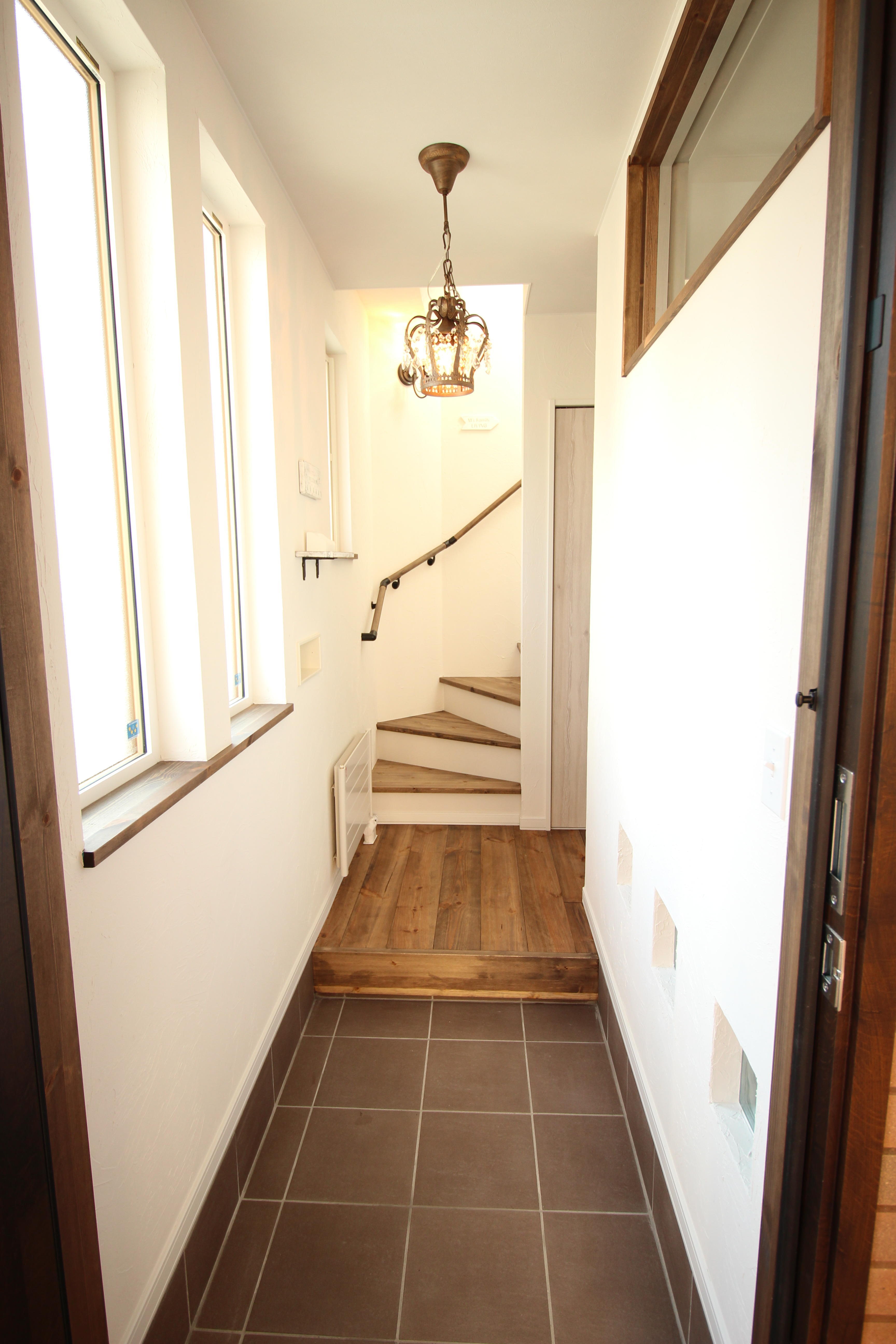 2世帯住宅の2つの玄関の内、若夫婦のフレンチカントリーテイストの玄関を演出しています。仕切りの壁に塗り壁を使っているのも演出のひとつです。階段も無垢の板を使うなどして、カントリーテイストを作り出しています。