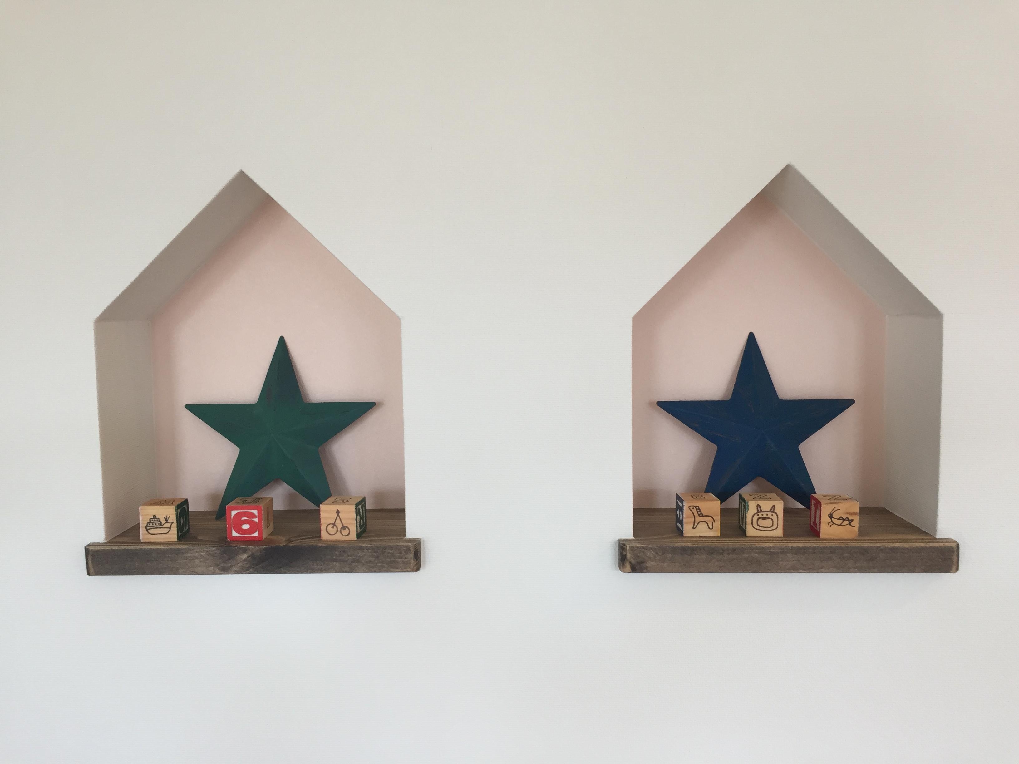構造上問題ない壁にはニッチをつけました。単純に可愛いですよね。壁にアクセントを付けられますし、飾る楽しさもありますよね。家型のニッチなんて可愛くないですか?中のクロスも色を変えています。