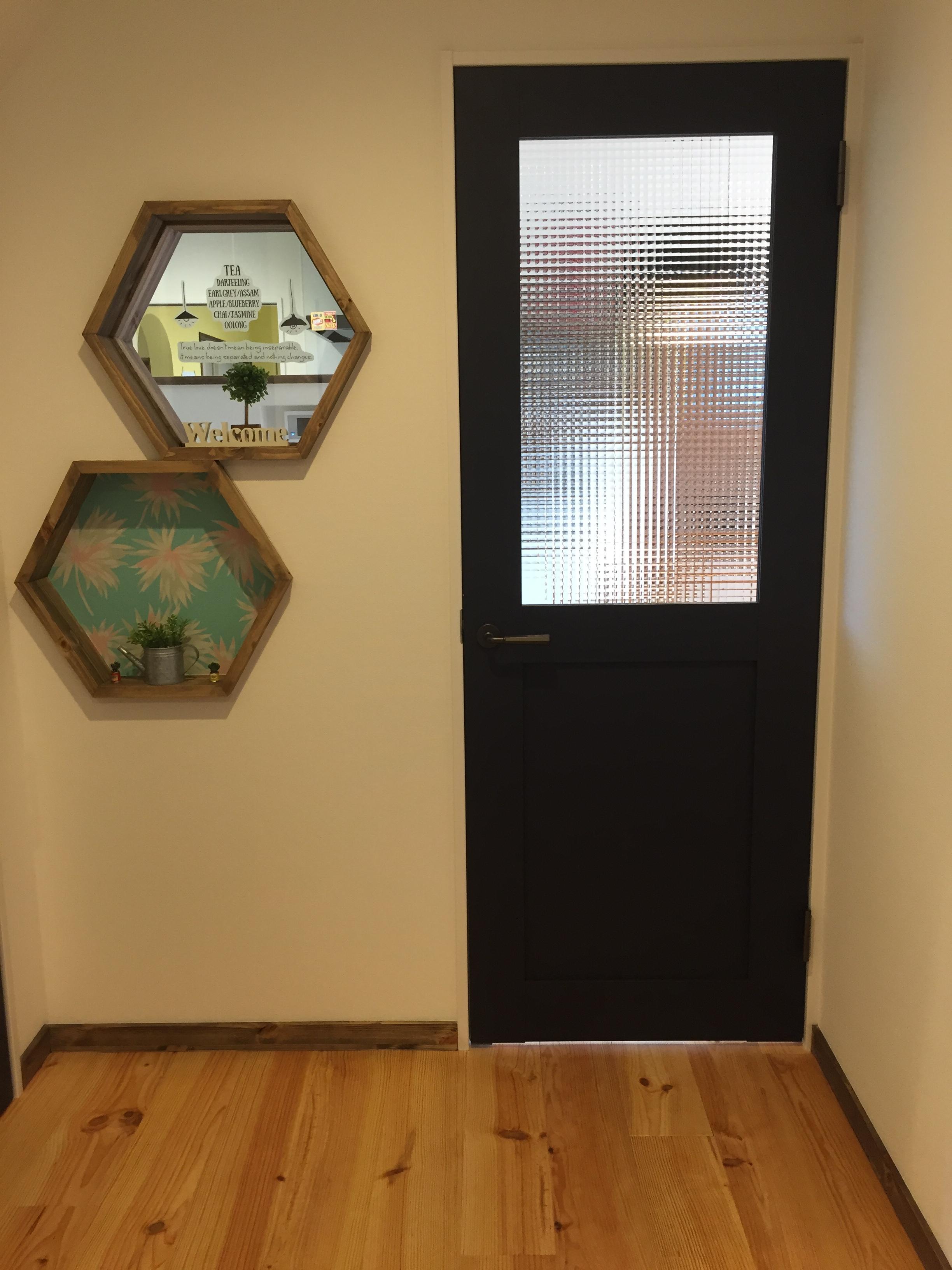 リビングルームに入るドアは素敵にしたい!!そんなご希望から、ドアの窓部分はモザイクバージョンにして、少しレトロなテイストにしました。サイドの硝子は、お嬢さんが帰ってきて、2階に直接上がっていくのを分かるようにと、ご希望がありました。ホール階段ならではの計らいですね・・・