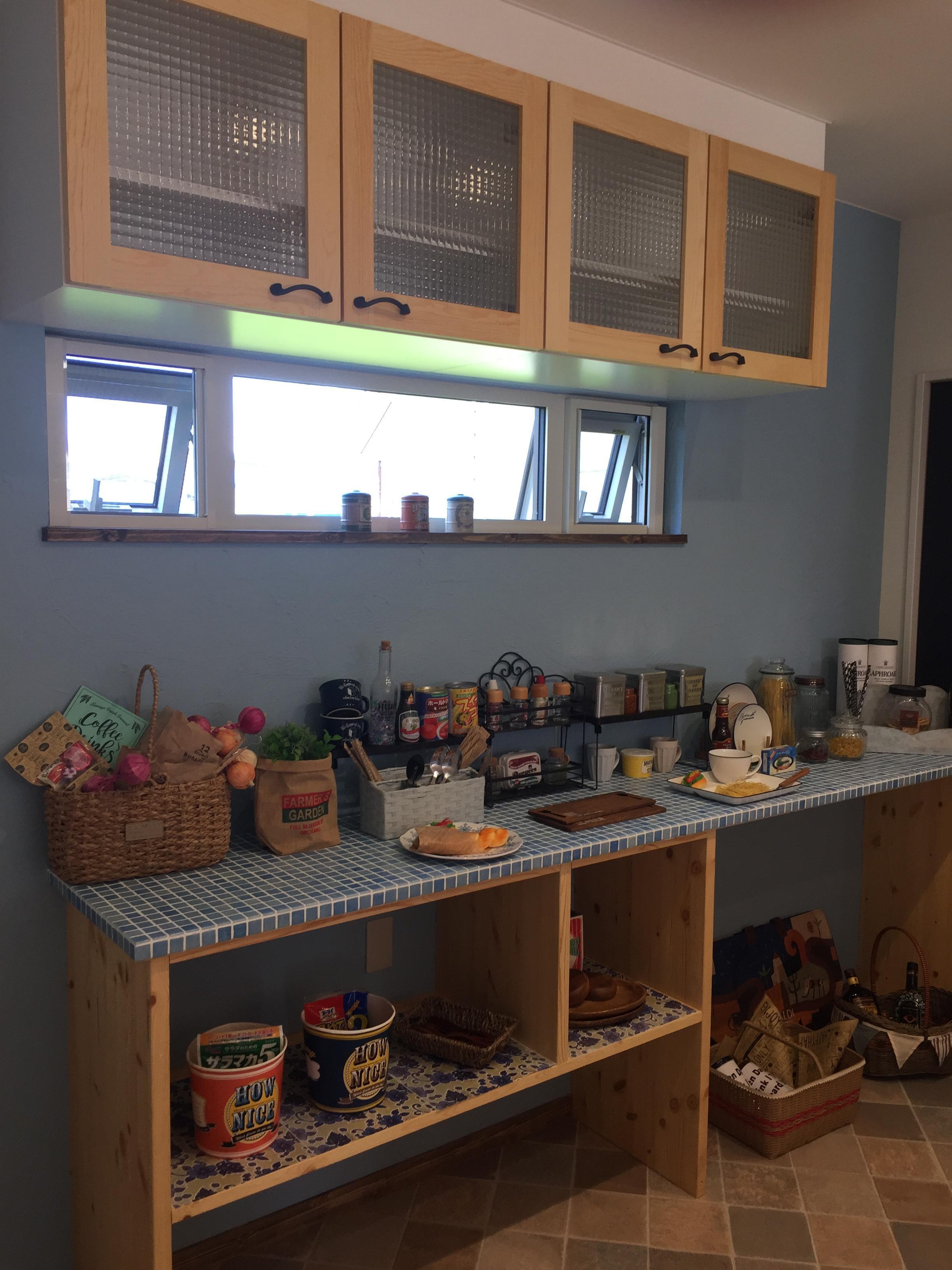 キッチンのバックカウンターです。バックの壁はカリフォルニアブルーですね。カリフォルニアの海と空の色をイメージしています。ゴミ箱や炊飯器、レンジ、コーヒーメーカーなど、それそれを配置できるように棚が配置してあります。しかも、可愛らしく天板はモザイクタイルで仕上げています。