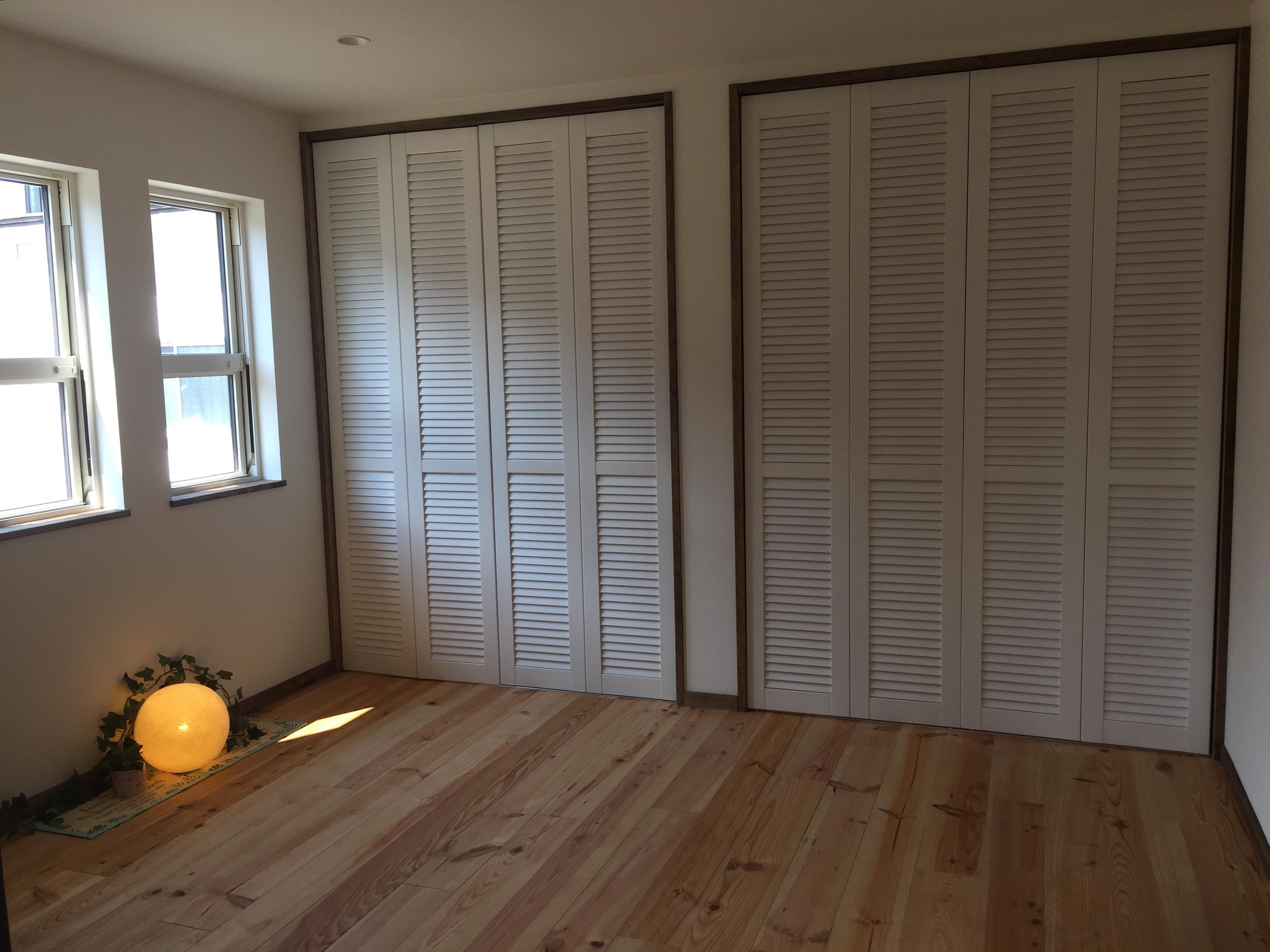 築39年らしく、寒くて古びた感じのスペックでしたが、サッシや断熱材も含めて省エネ基準までスペックを高めました。当社のリノベーションの第1歩は性能基準を現在の新築の基準まで上げることからスタートします。暖かい家でなければ意味ないですよね。そして内装はお客様の好みを聞いて、カリフォルニアテイストで仕上げてあります。無垢のフローリングにガラリの収納扉がアメリカンテイストを表現していますね。