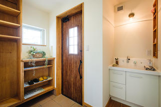 リビングの1面の壁を塗り壁にして、皆様と一緒に作業させていただきました。とても楽しそうに塗り壁の作業をされていました。記念に娘様お二人の手形を塗り壁に納めました。一緒に作業することによって、その仕事の大変さをご理解いただくと共に、引き渡し後訪れたお客様に「この壁私たちが塗ったんだよ!」と自慢をして欲しいのです。そうすることで自分たちのお家に愛着を持って頂ける、そんなリノベーションを心掛けております。お客様参加型をこれからも続けていきます。