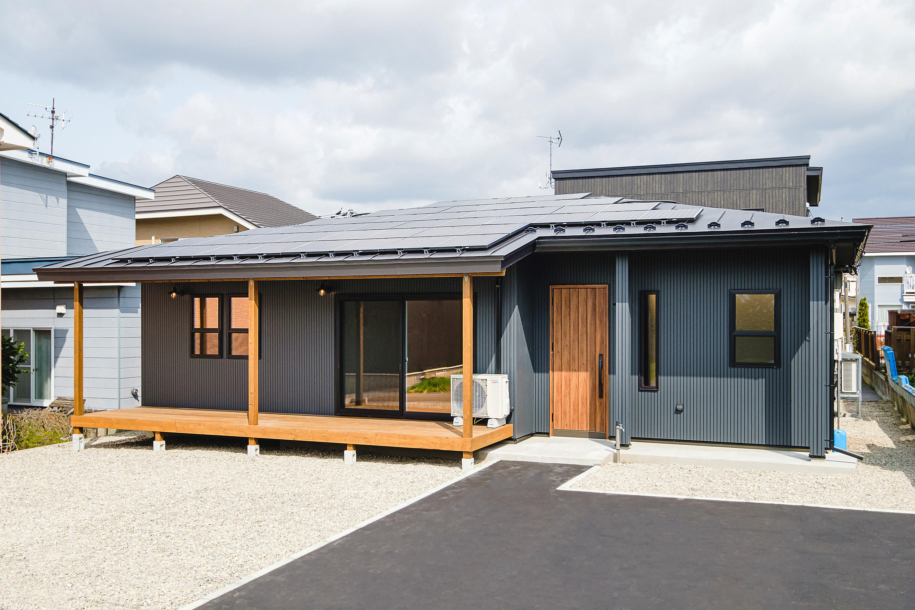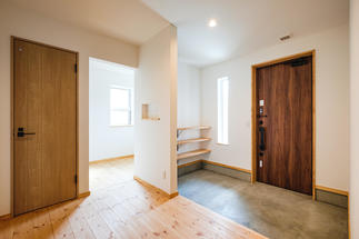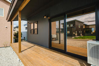 リビングからつながる大きなウッドデッキ、開放感のある玄関ホール、お施主様の愛犬と家の中でも外でも楽しく暮らすをコンセプトに、