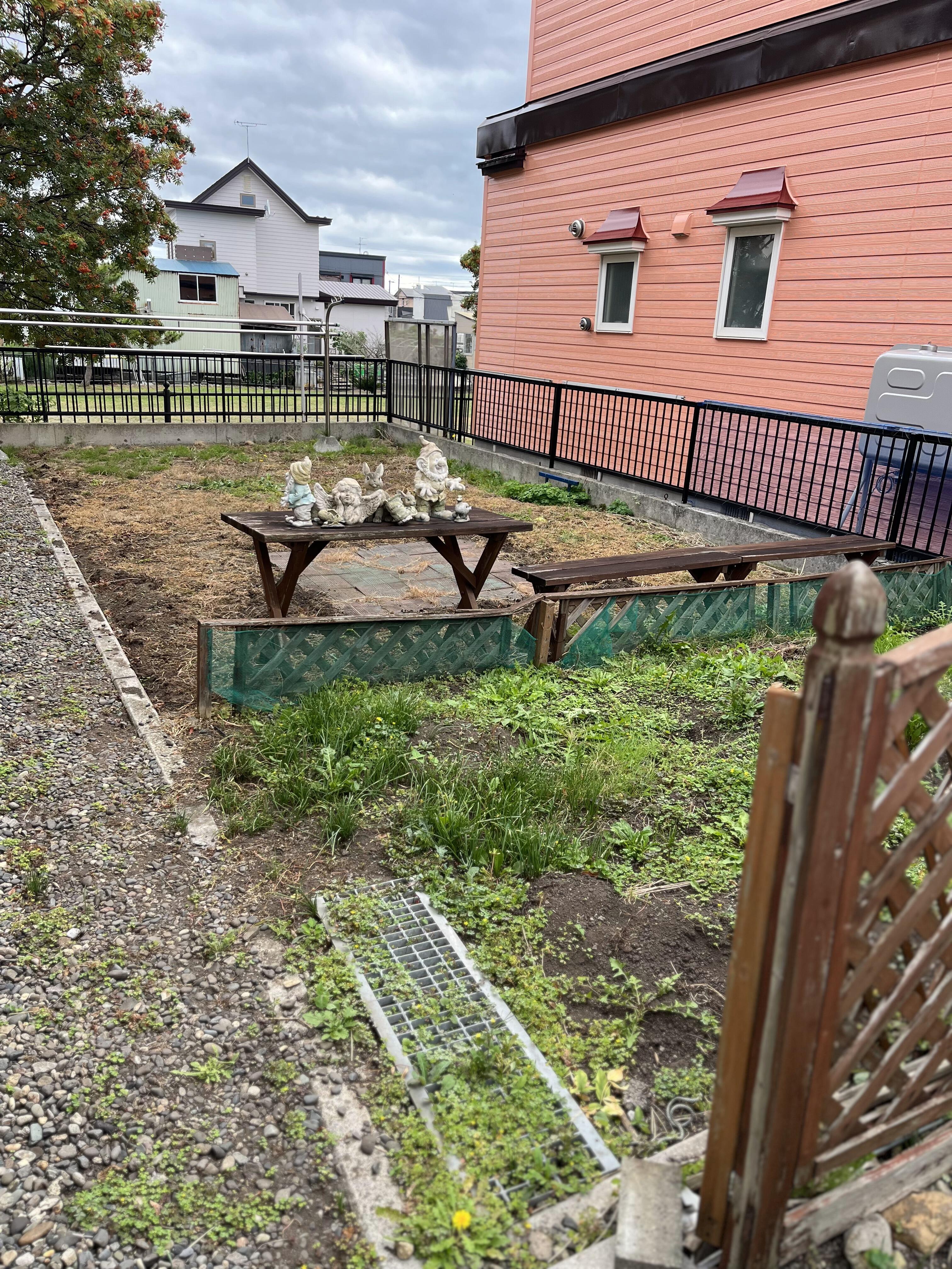既存のお庭にある今は使っていない木製のテーブルやベンチ、フェンスを撤去し家の周りとお庭全部に防草シートを敷き20mmの砕石を敷き詰めました。