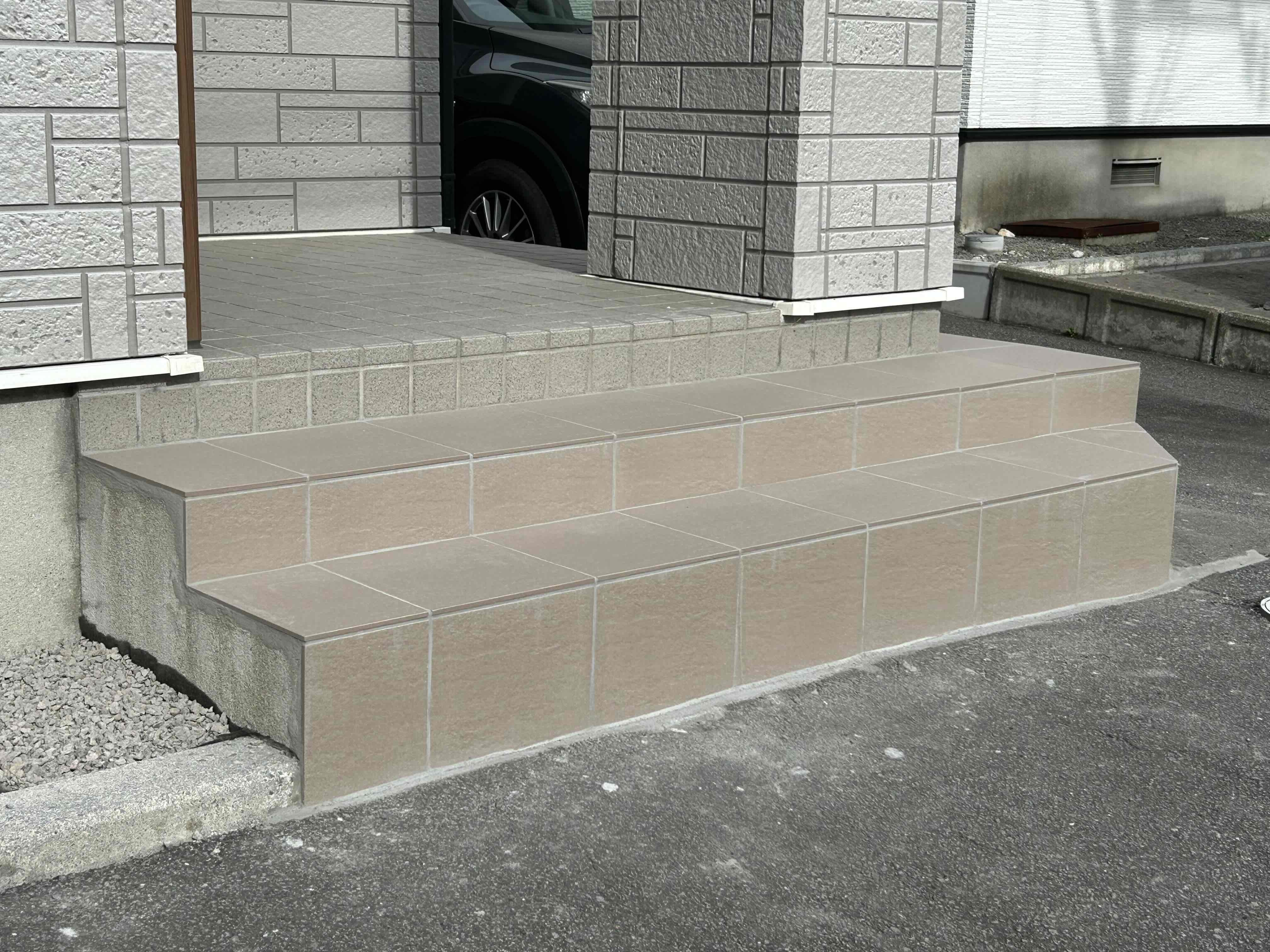 また経年劣化で欠けていた玄関ポーチ階段タイルも、一部貼替を致しました。