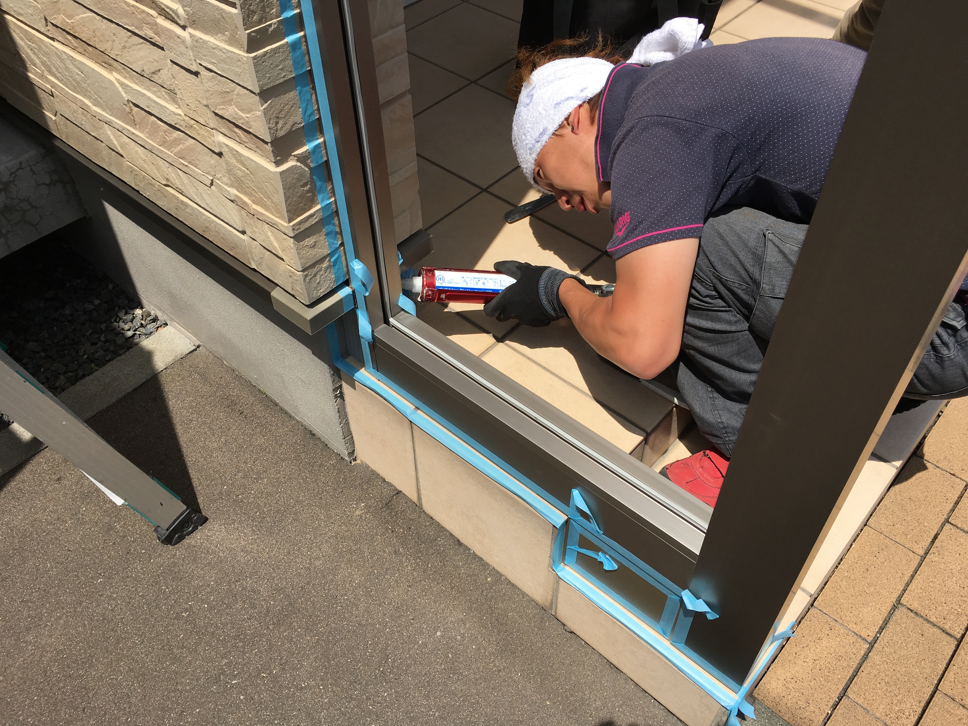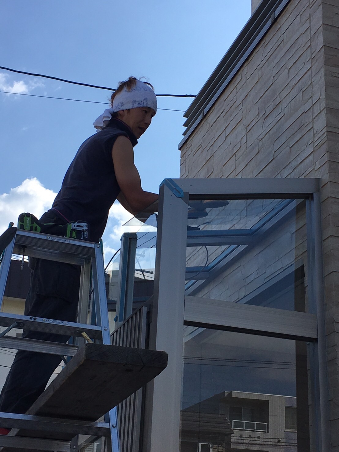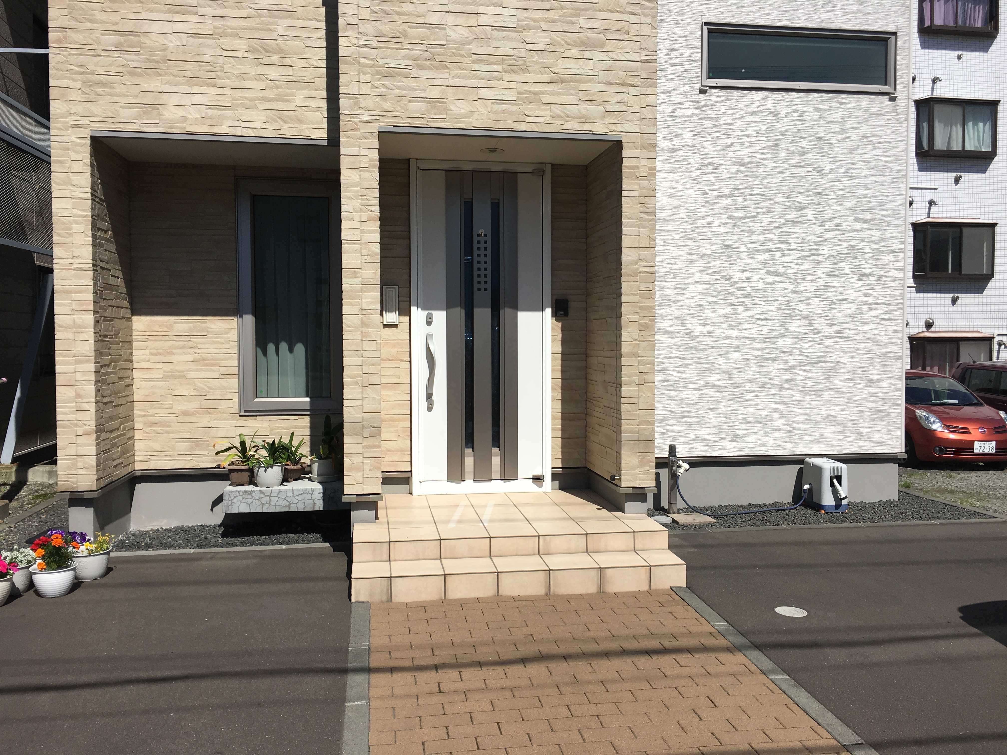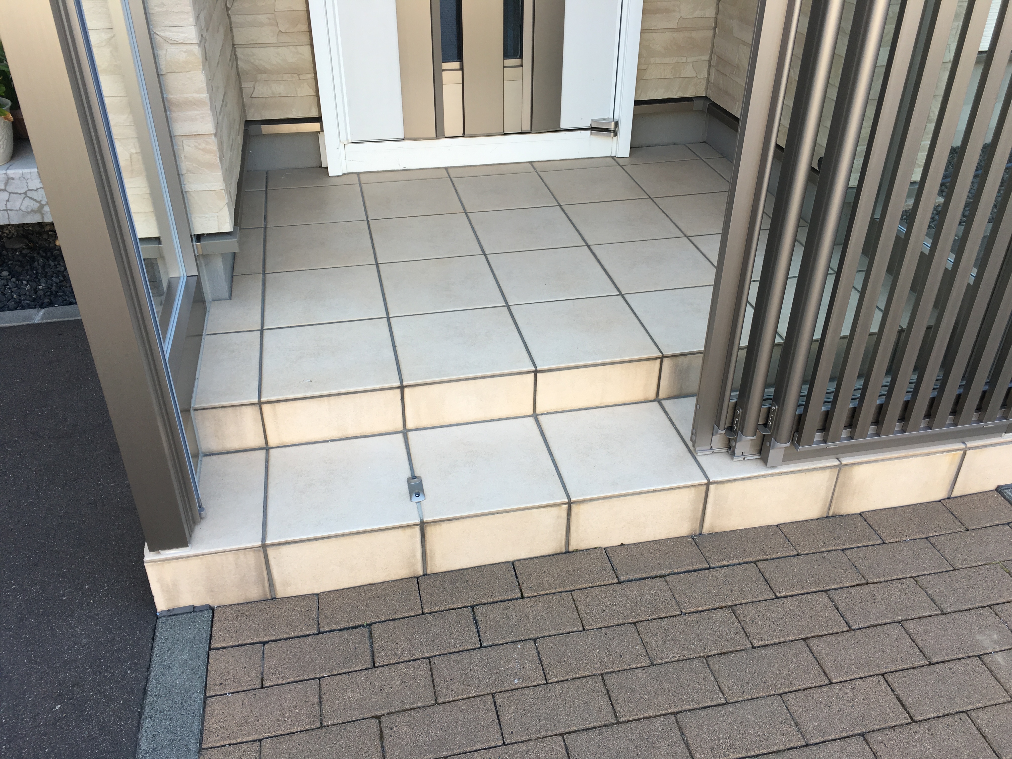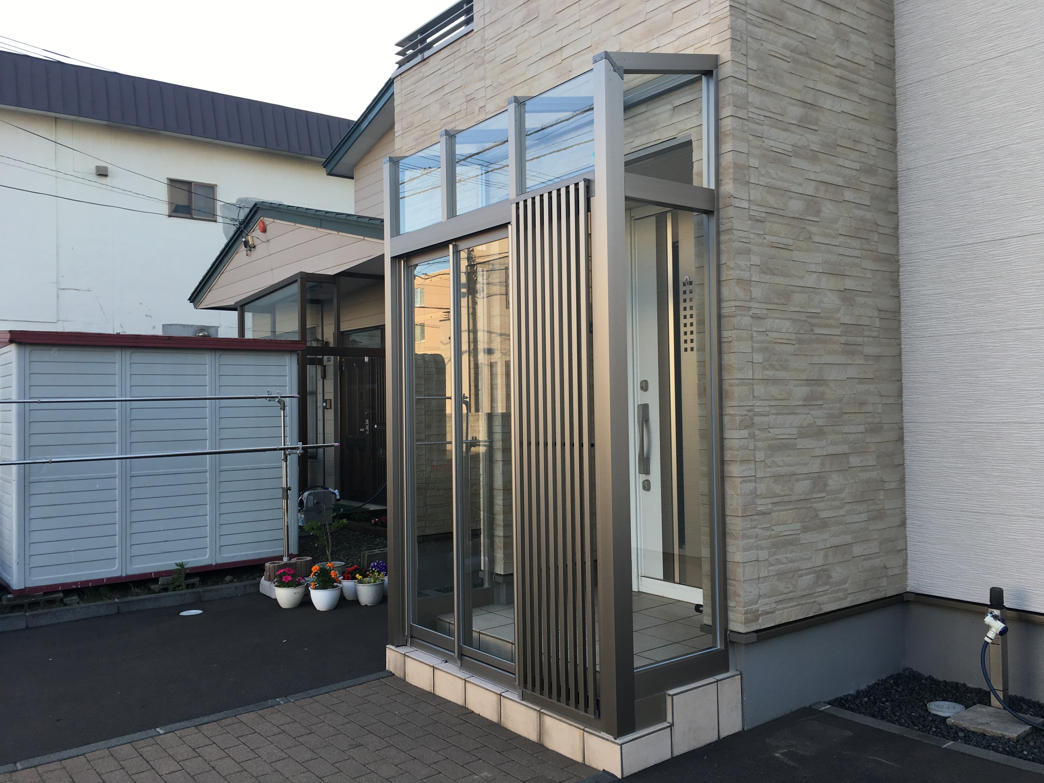 玄関風除室の取り付け事例です。モダンな建物に合わせ屋根ガラスを「突き付け納まり」にした高級感ある仕上がりです。床レールのない二枚連動式の引戸でスッキリしたデザインと防寒を両立しています。普段は実用的な空間として、冬場は防寒と雪で滑って危険なポーチ階段の囲いとしてとても実用的なエクステリアです。