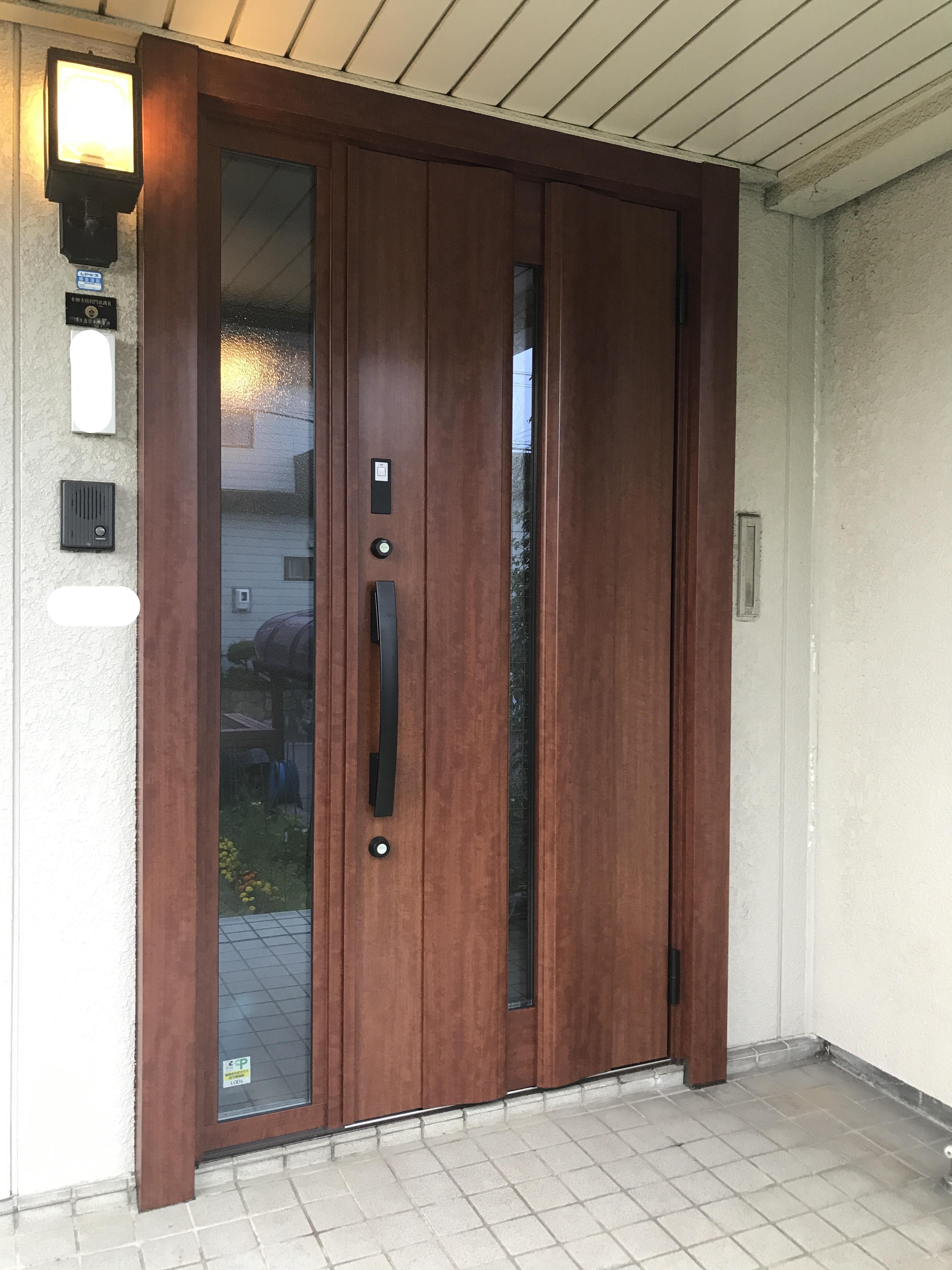木製の玄関ドアが古くなり表面が剝がれ、すきまも有り、交換する事になりました。 デザイン・色にこだわりイメージを壊さず重厚感が出ました。 タッチキーも採用して鍵の開閉も楽々です。