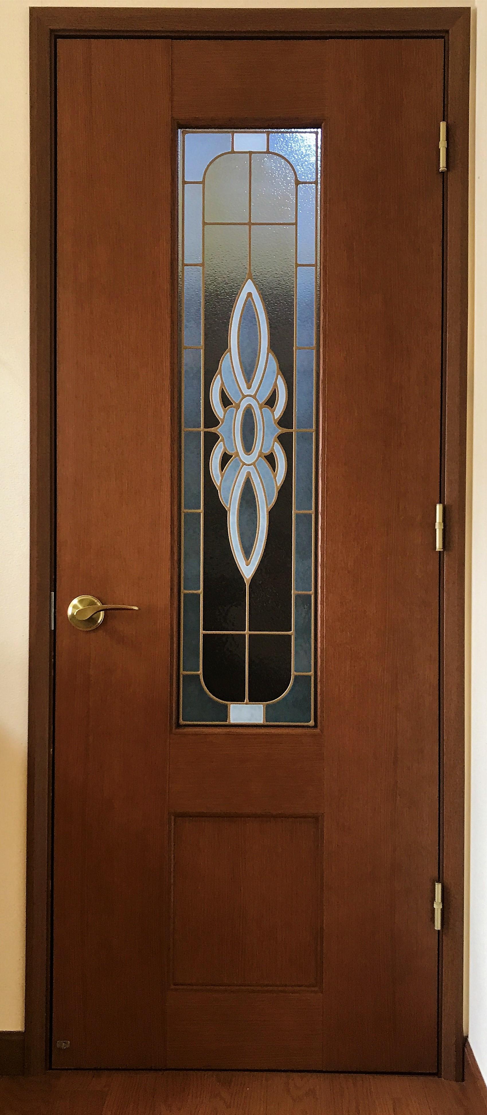 今回、施工させて頂いた扉には、ステンドグラスを入れて光をたっぷり通し落ち着きのあるリビングのアクセントとなりました。
