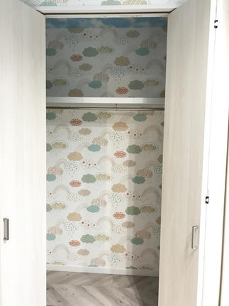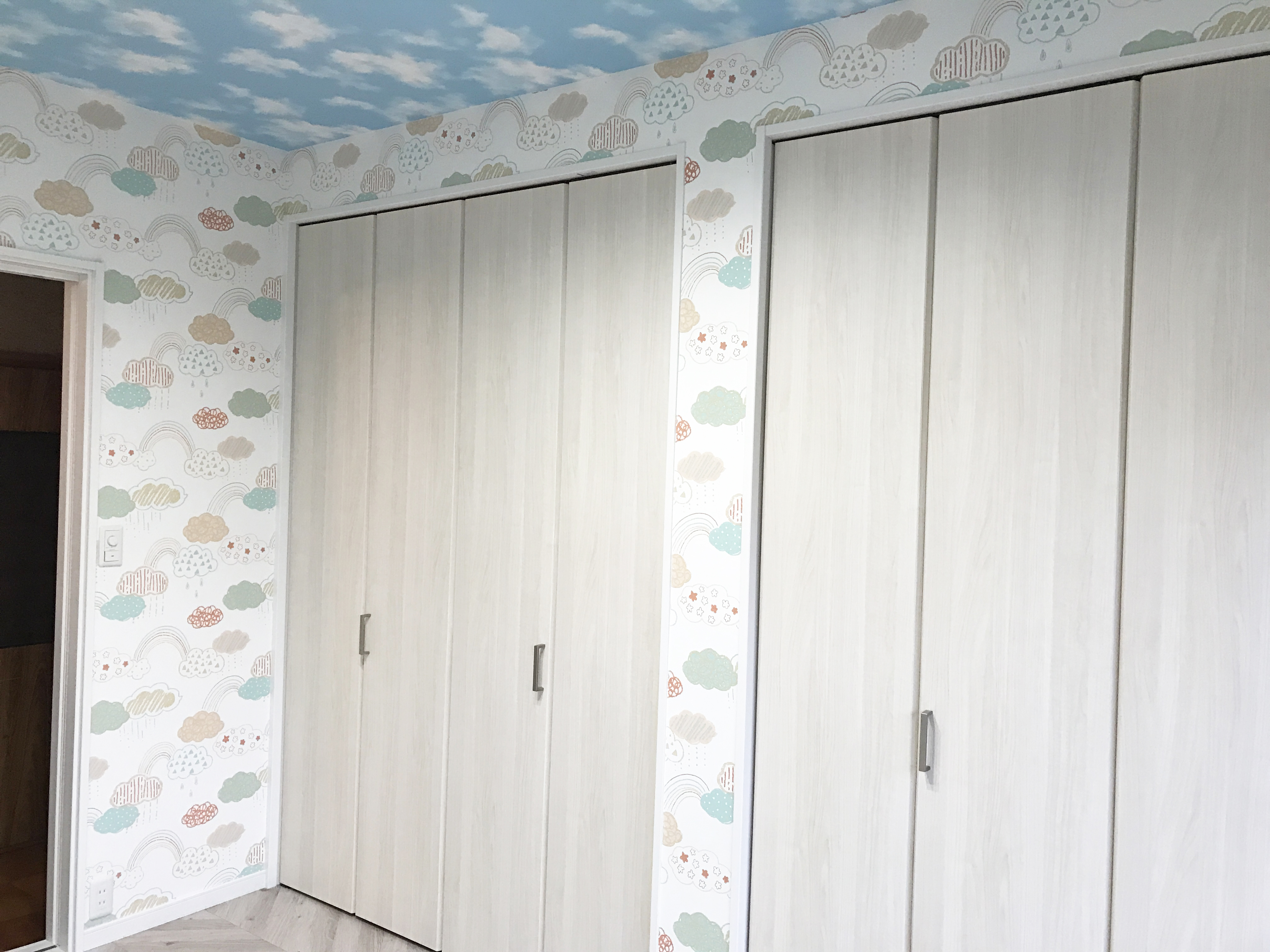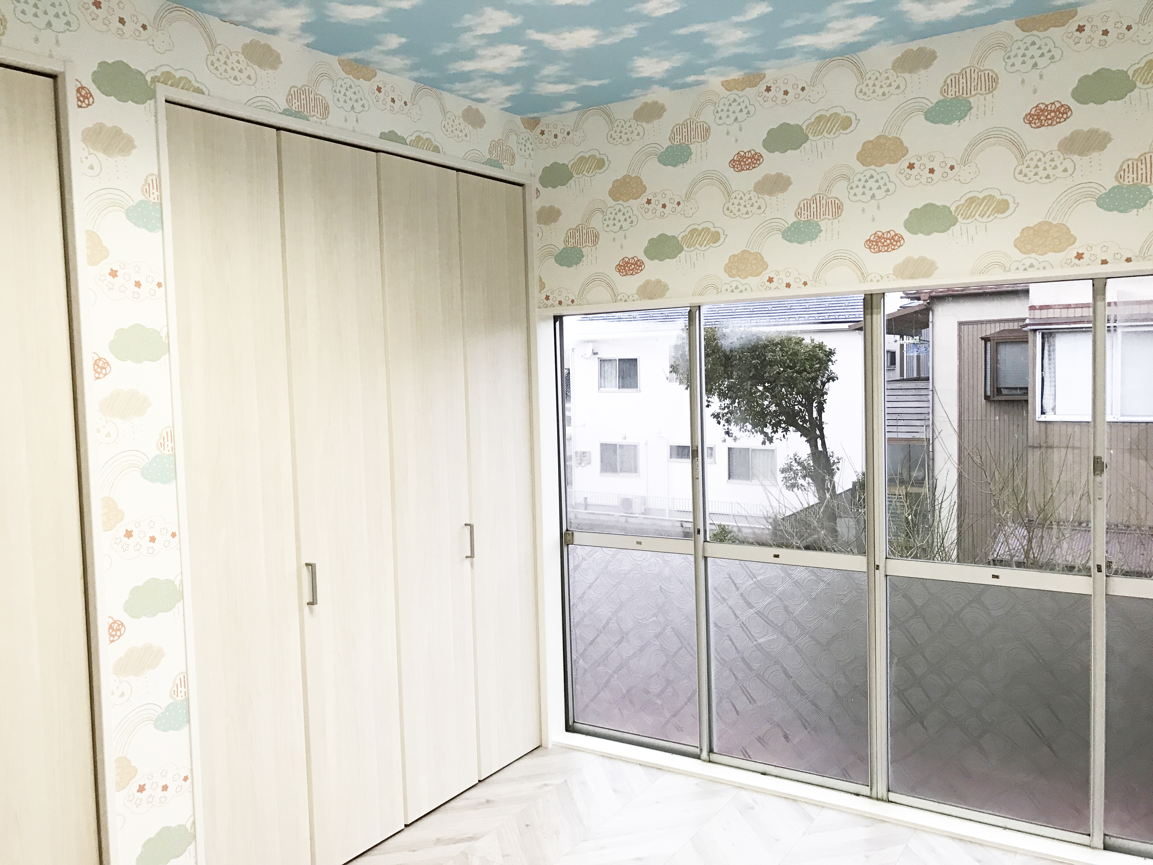塗り壁だった壁もポップで可愛らしいデザインのものを選ばれました。床や建具の色ともマッチしています。