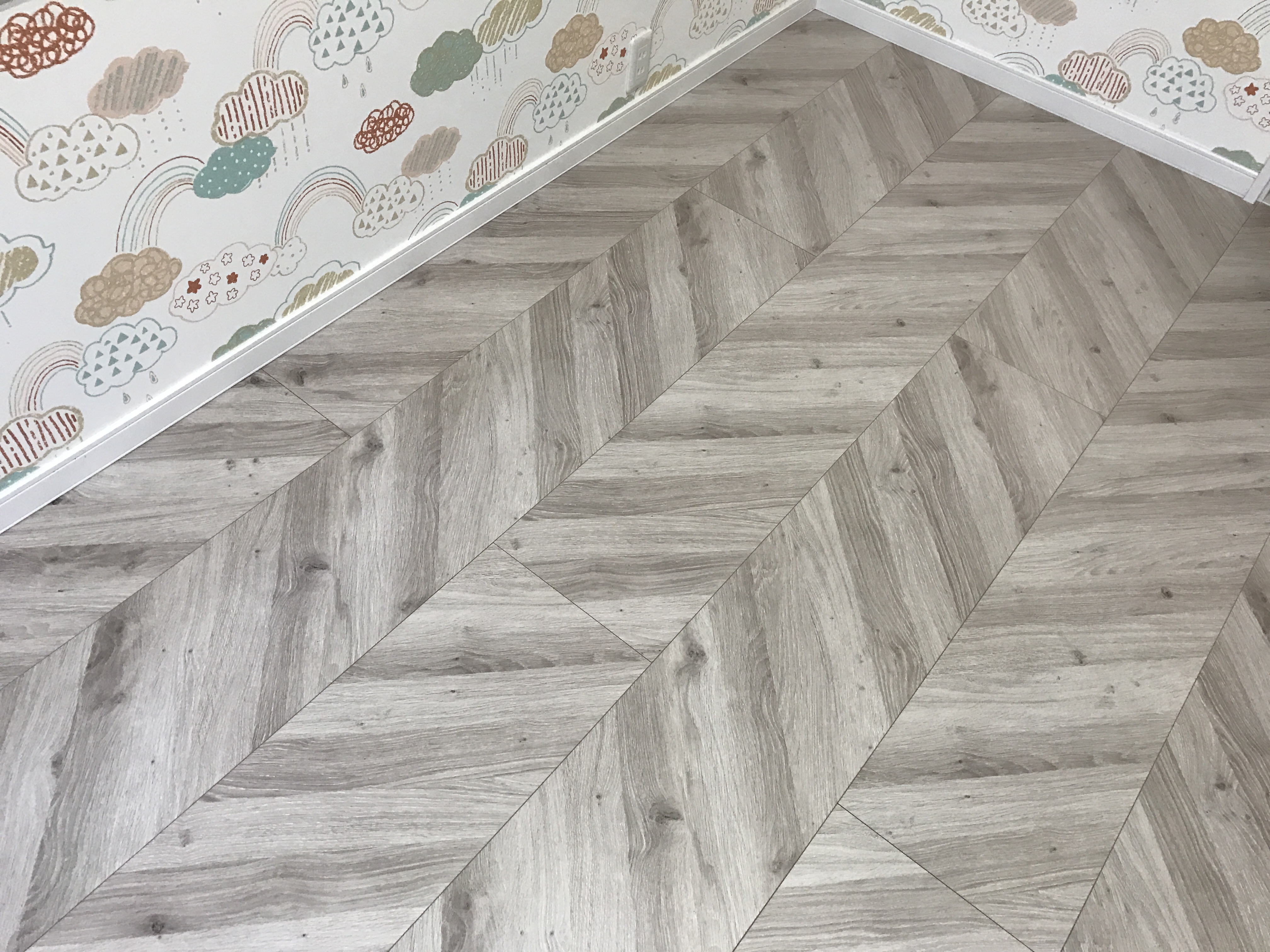畳敷きだった床はフローリングにチェンジ。LIXILの床材「ラシッサDフロア」というシリーズの中からフレンチヘリンボーン調というデザインを選びました。