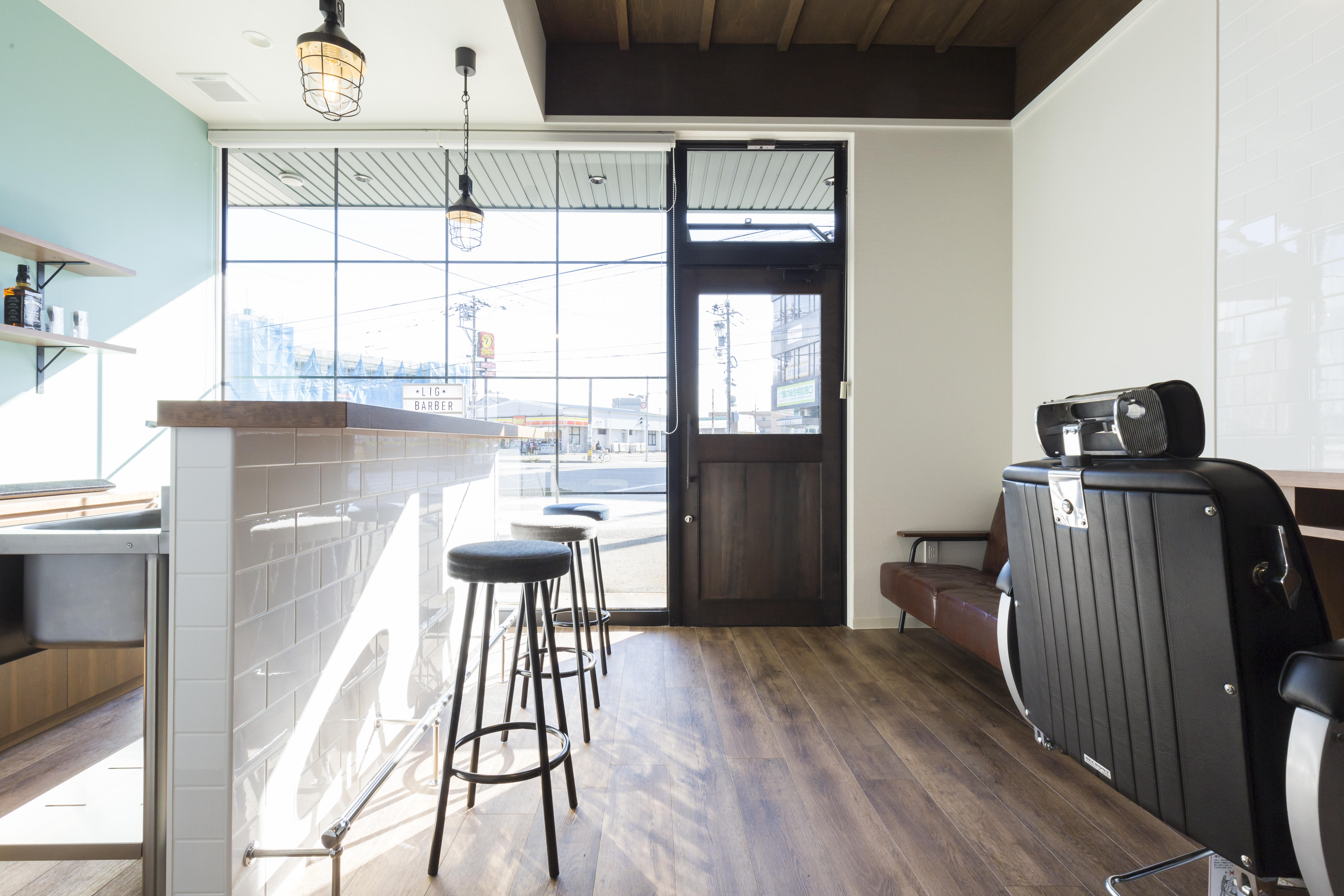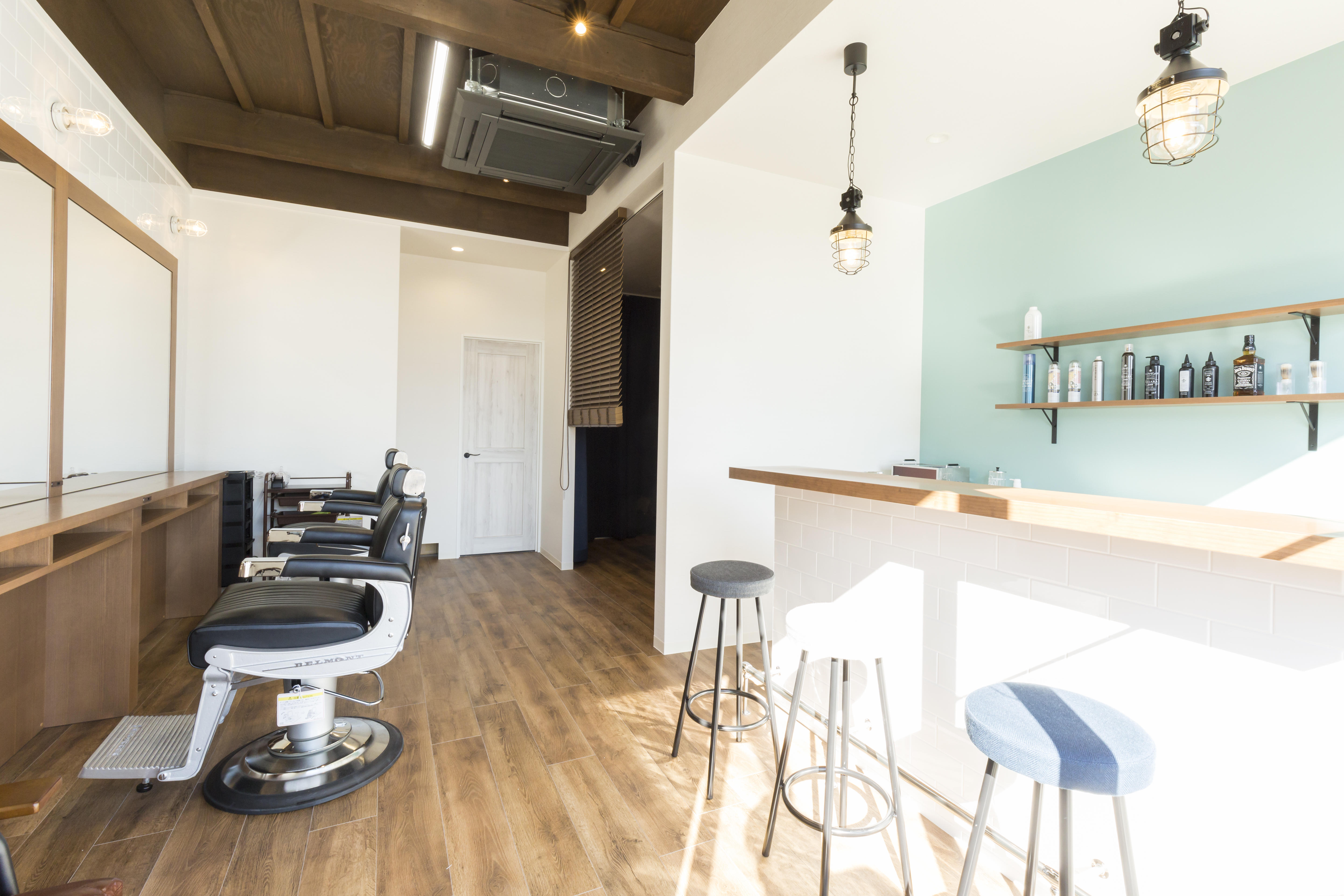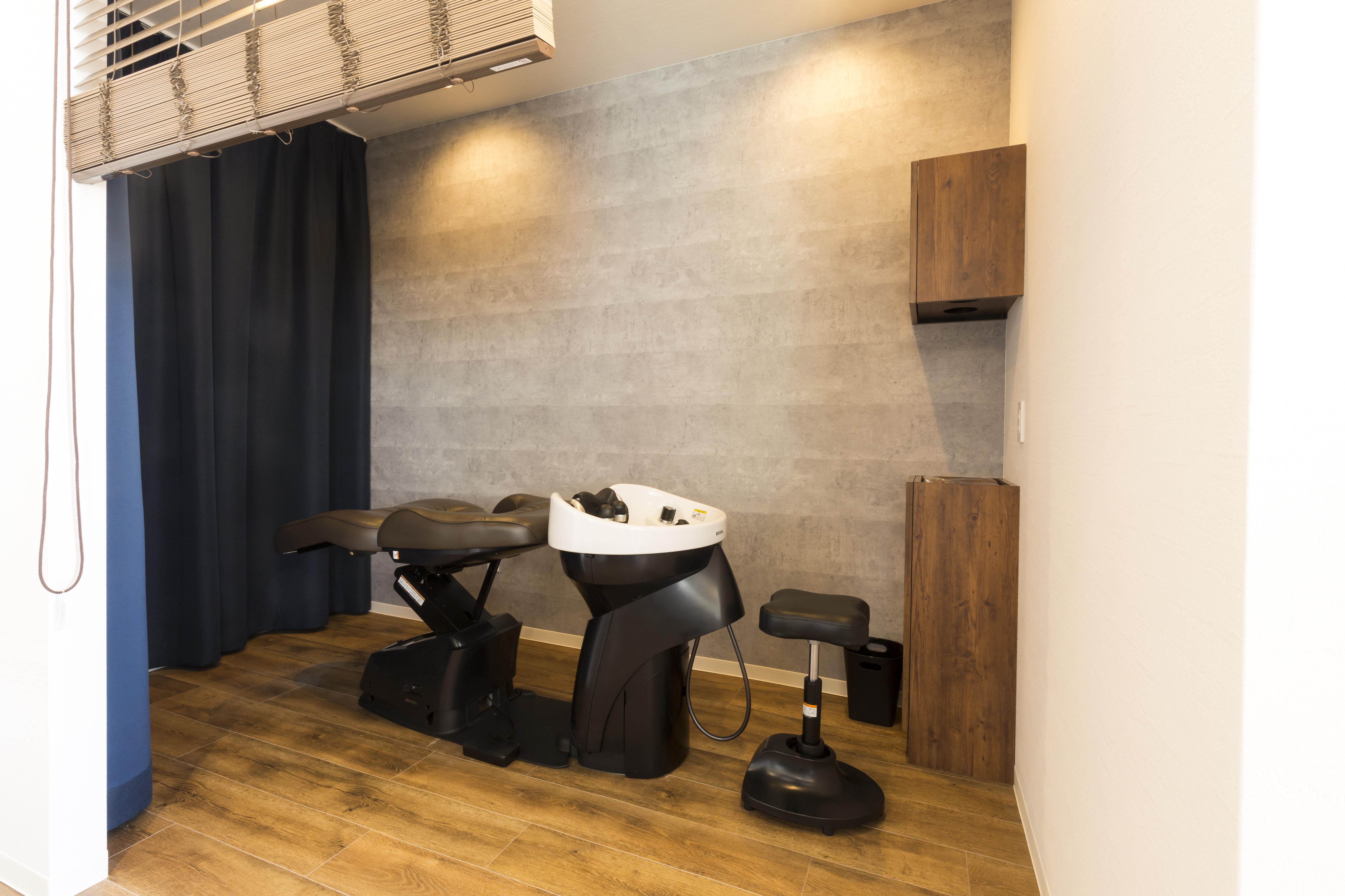 理容室という事でシェービングや脱毛も行う重要な場所。よりリラックスしていただけるように半個室のような空間に仕上げました。カーテンとブラインドで仕切ってあるだけなの普段は開放的な店内。ほんのり個室感を出したいときはブラインドを下げて。光も通したくない時はカーテンを引いてあっという間に個室へと大変身。照明は調光を付け、作業に合わせて光を調節することができます。