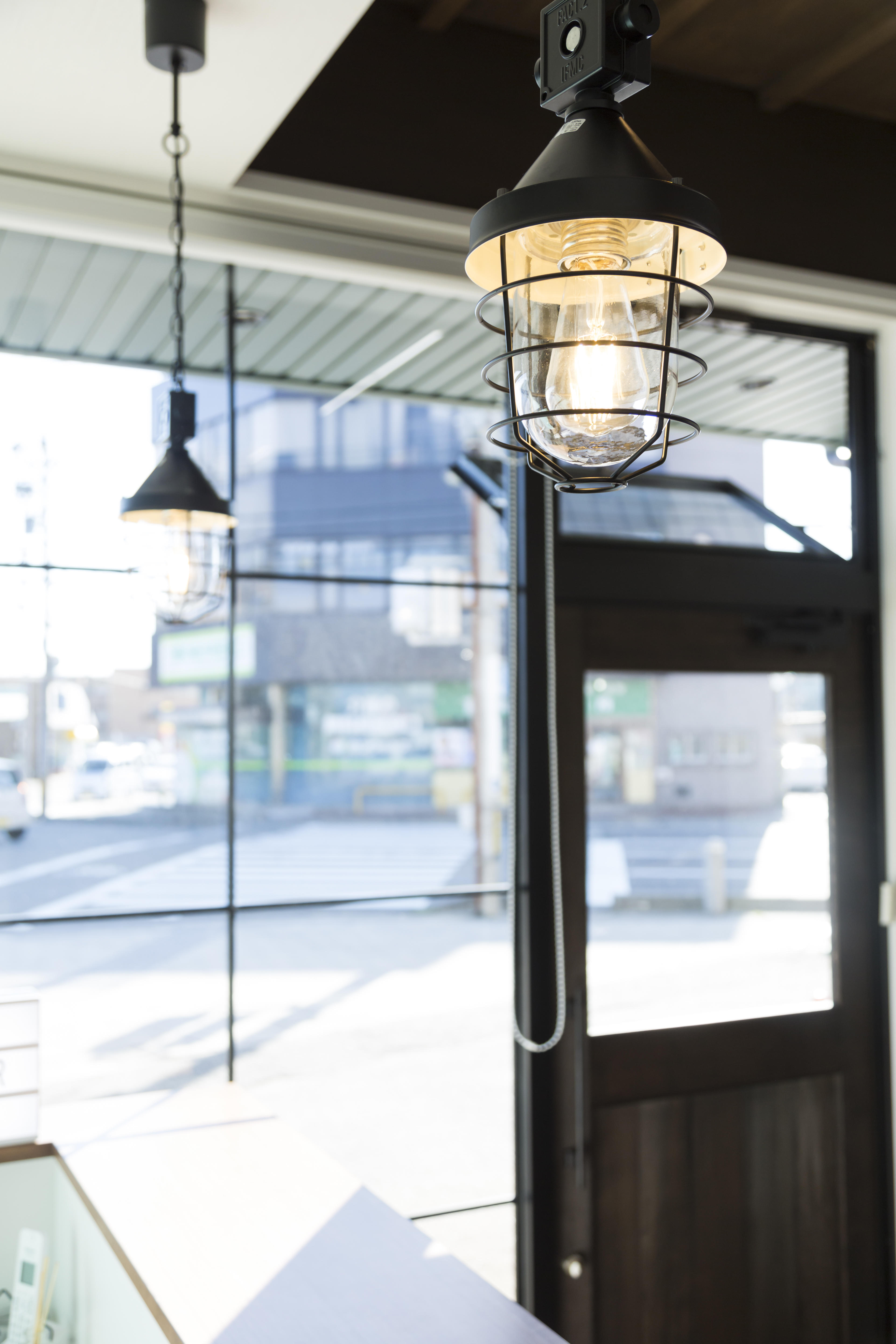 外から見ても中から見てもオシャレなペンダントランプ。より一層店内をかっこよくしてくれるアイテムです。実はこの電球LEDなので、光熱費も抑えています。こちらは施主様のこだわりの品。