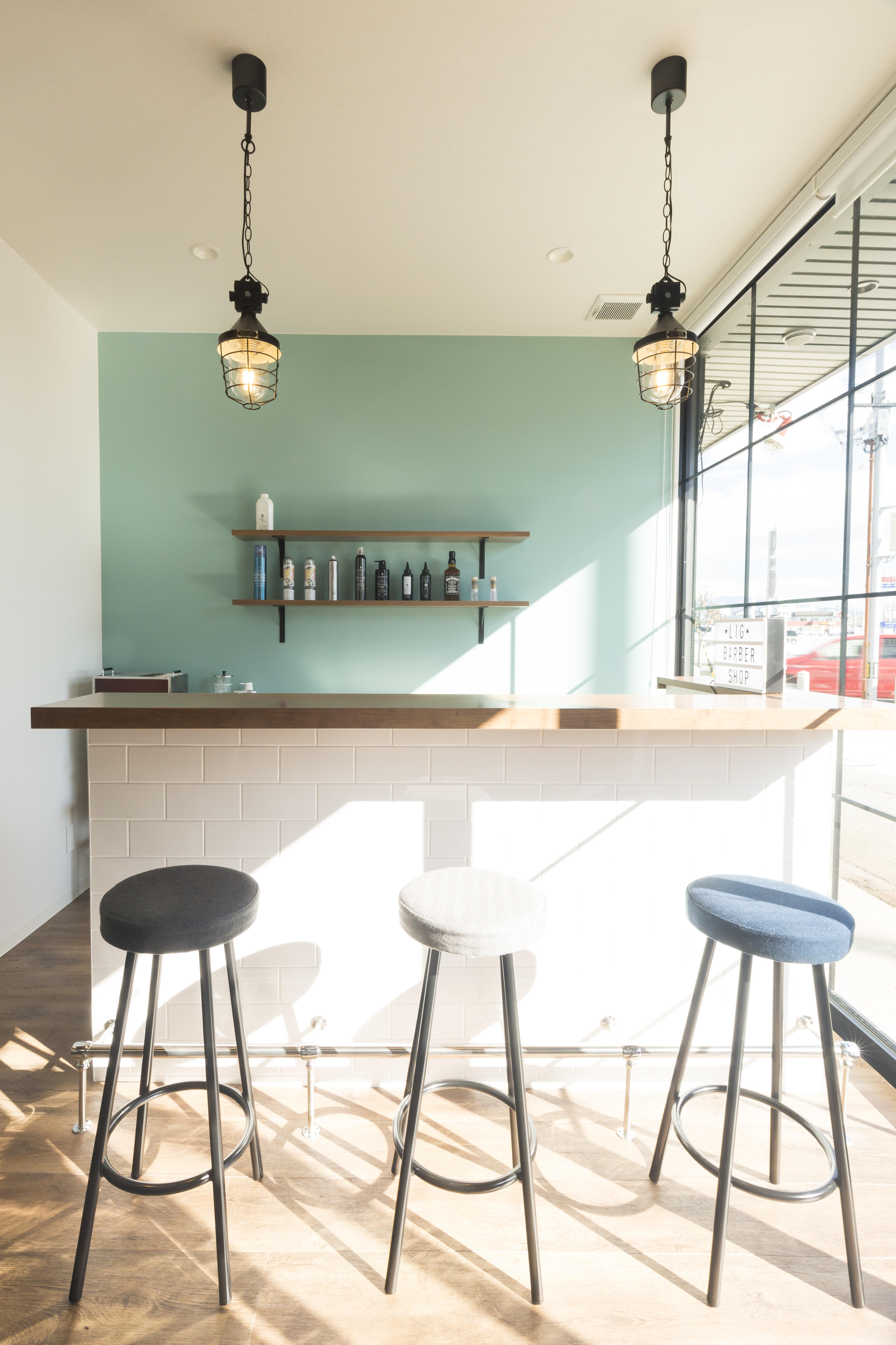 カウンターは造作で作りました。高さまでしっかりこだわり、待合のお客様ともコミニュケーションのとりやすいように開放感のある待合席。西海岸をイメージしたグリーンを使いさわやかな雰囲気を作りました。外から見ても中から見てもオシャレなペンダントランプは施主様こだわり。