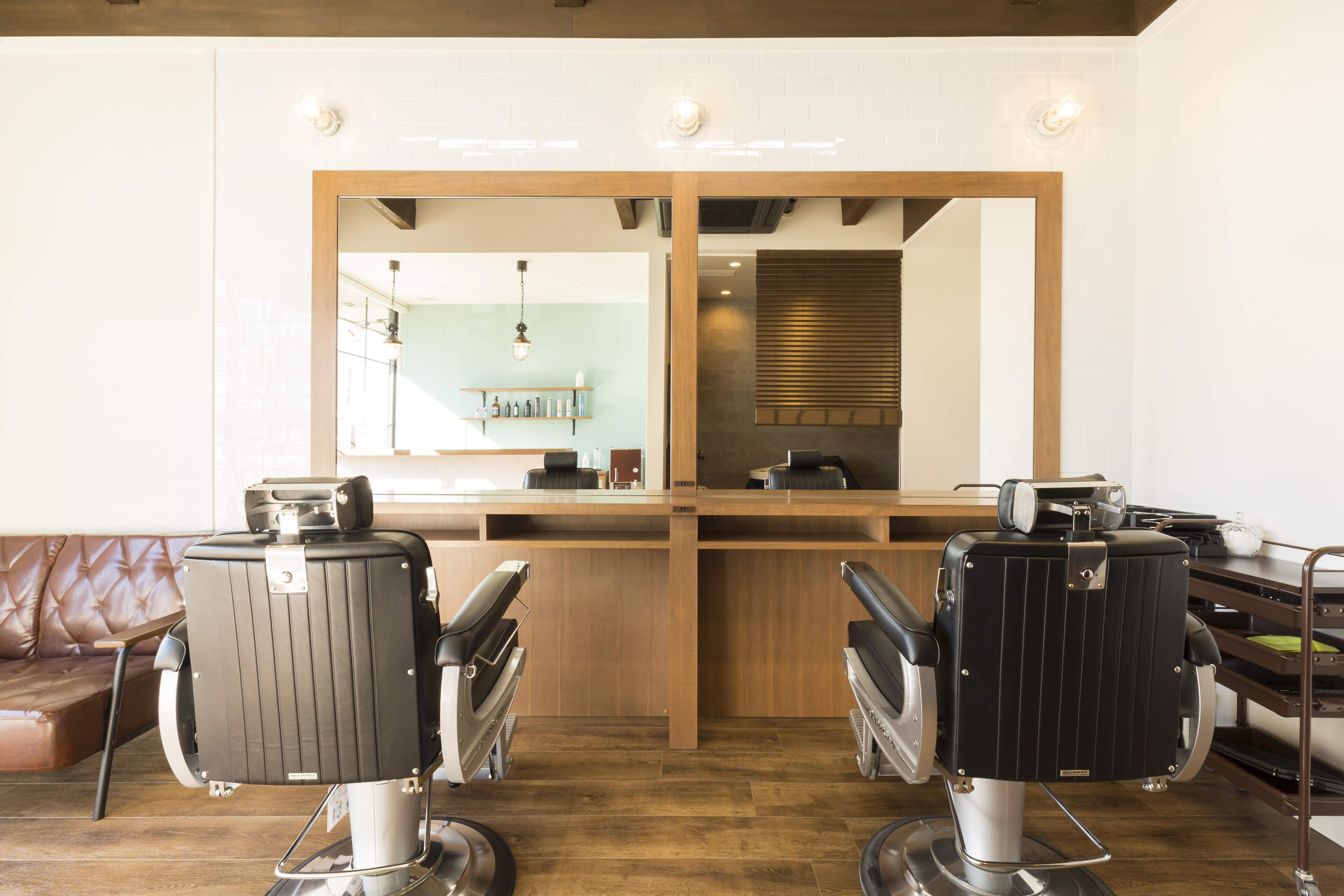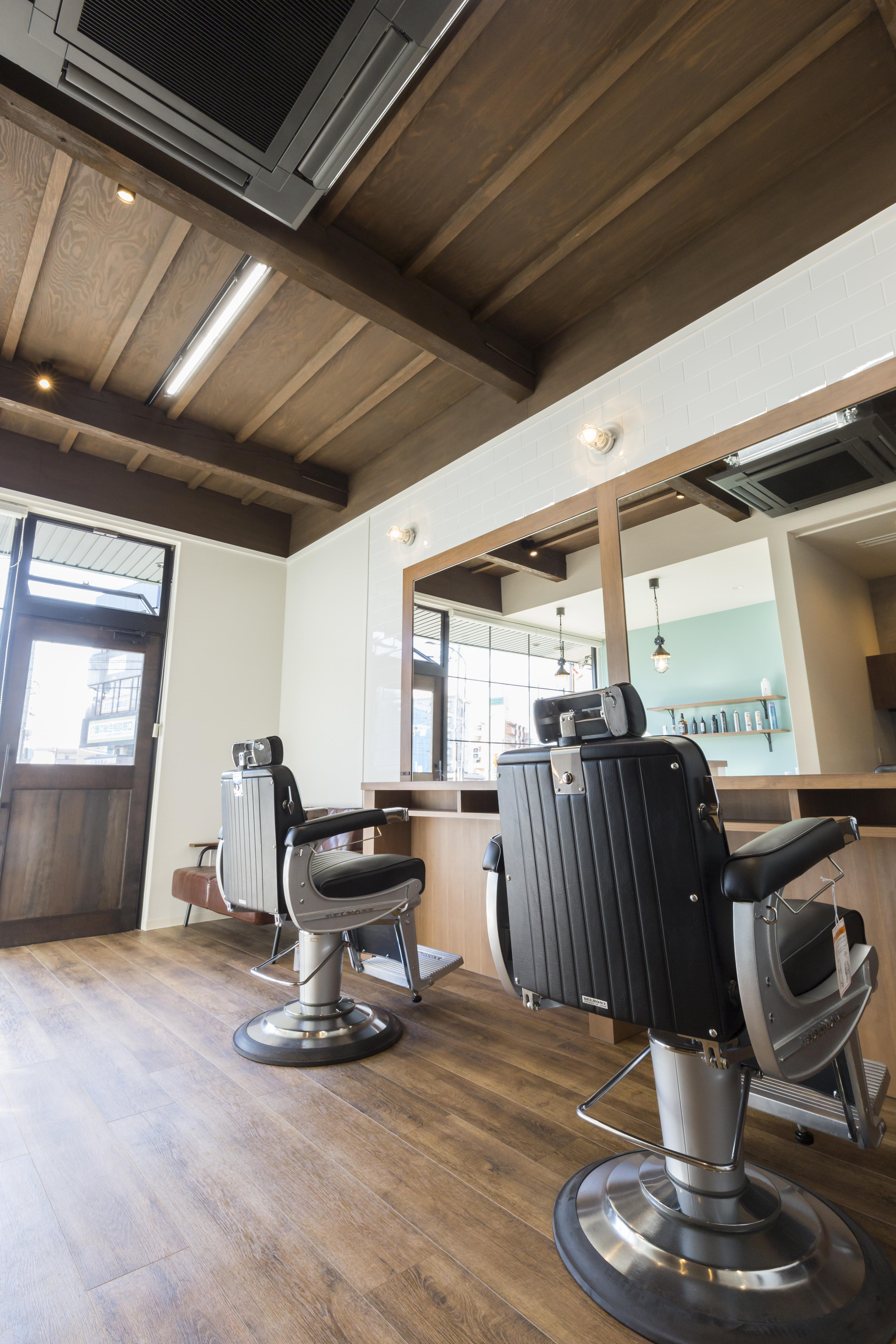 カットスペースは2席。約33㎡の店内をより広く見せるために大きな鏡を取り付けました。鏡を覗くだけで店内が一望できます。壁には白いタイルを貼り、カウンターは奥行や幅まで細かくこだわり抜きました。天井は堀上天井梁を見せ、天井高も高くしたので開放感もあります。