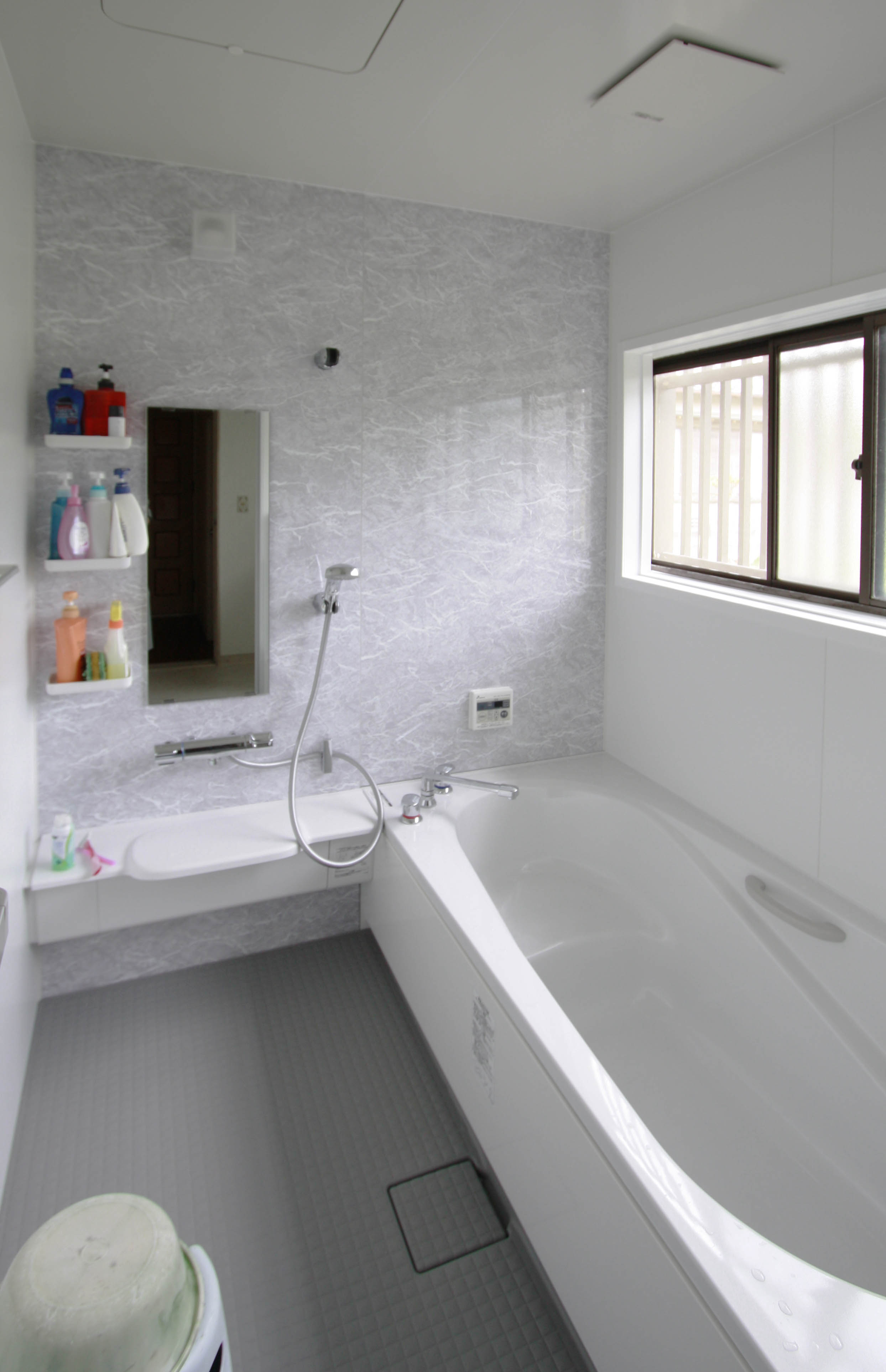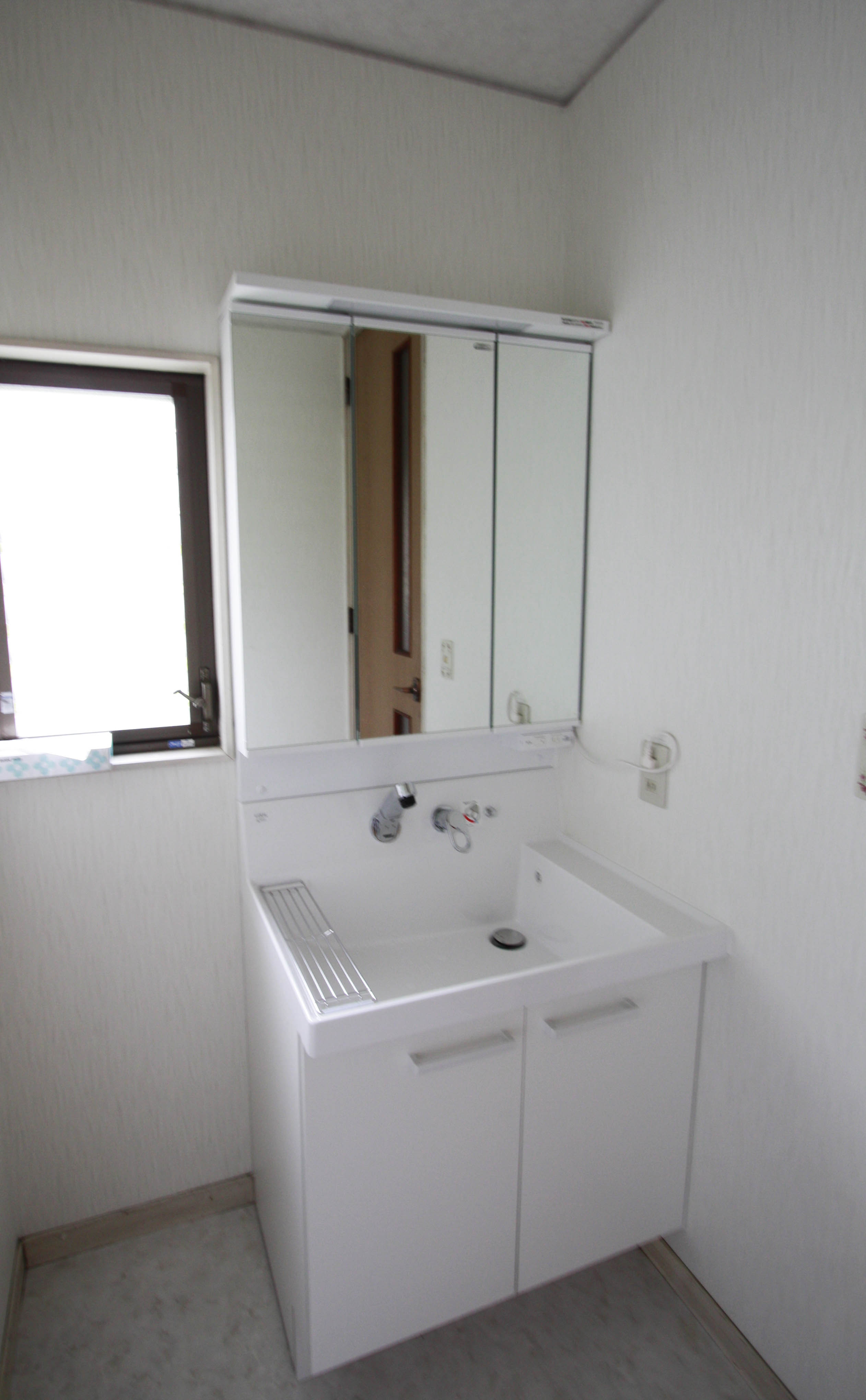 浴室を在来工法のものからユニットバスに交換しました。また、洗面脱衣室のクロス張替と洗面台の交換もさせていただきました。
